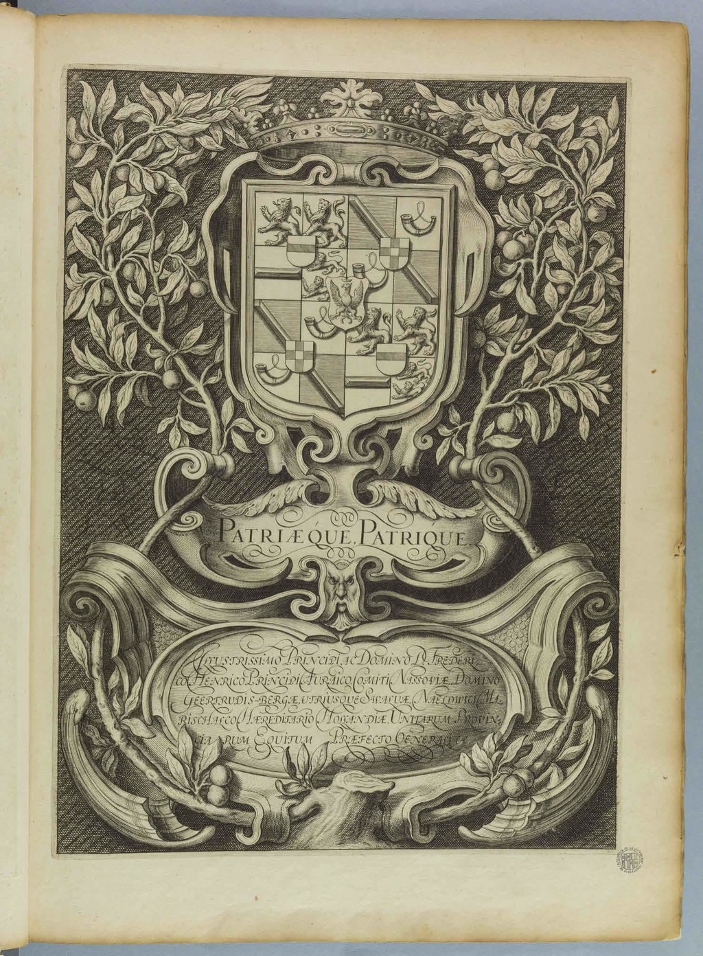 Illustrissimo Principi ac Domino D. Frederico Henrico Principi Auraico, Comiti Nassoviæ, Domino Geertrudis-Bergæ, utriusque Swaluæ, Naeldwici Marischalco Hæreditario Hollandiæ Unitarum Provinciarum Equitum Præfecto Generali &c.