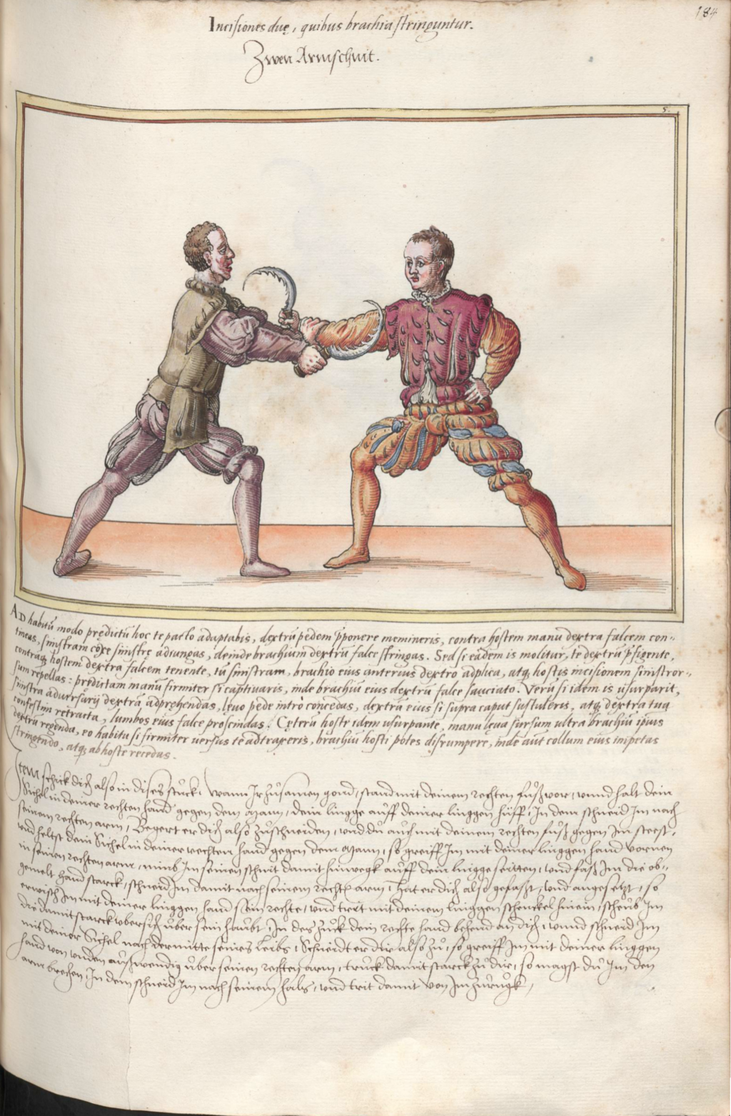 Item schick dich also in dises stuck, Wann Ir zusamen gond, stand mit deinem rechten fuß vor, vnnd halt dein Sichel in deiner rechten hand gegen dem Mann, dein lingge auff deiner linggen hüff, In dem schneid Im nach seinem rechten arm, Begert er dich also zuschneiden, vnd du auch mit deinem rechten fuß gegen Im steest, vnd heltst dein Sichel in deiner rechten hand gegen dem Mann, so greiff Im mit deiner linggen hand vornen in seinen rechten arm, nimb Im seinen schnit damit hinwegk auff dein lingge seitten, vnd faß Im die obgemelt hand starck, schneid Im damit nach seinem rechte~ arm, Hat er dich also gefaßt, vnd angesetzt, so erwisch Im mit deiner linggen hand sein rechte, vnd trit mit deinem linggen schenckel hinein, scheub Im die damit starck vbersich uber sein haubt, In des zuck dein rechte hand behend an dich, vnnd schneid Im mit deiner Sichel nach der mitte seines Leibs, Schneidt er dir also zu, so greiff Im mit deiner linggen hand von vnden außwendig uber seinen rechten arm, truck damit starck zu dir, so magst du Im den arm brechen, In dem schneid Im nach seinem hals, vnd trit damit von Im zurugk,