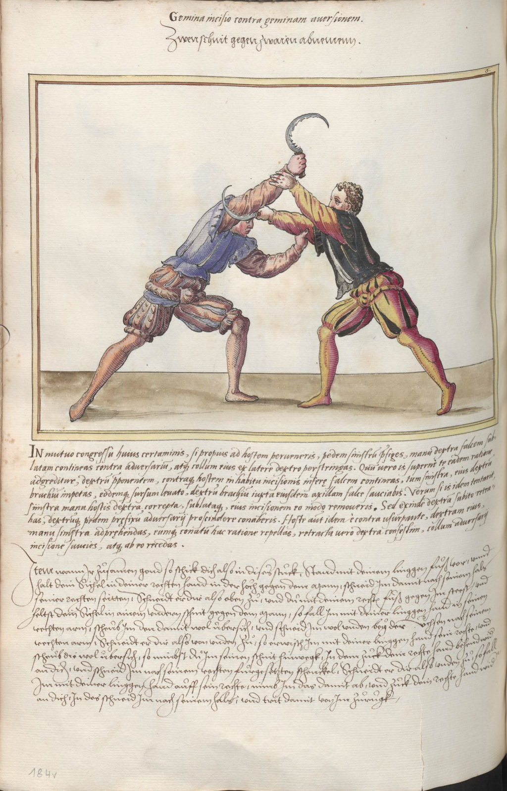 Item wann Ir zusamen gond so schick dich also in dises stuck, Stand mit deinem linggen fuß vor, vnnd halt dein Sichel in deiner rechten hand in der ho°ch gegen dem Mann, schneid Im damit nach seinem hals seiner rechten seitten, Schneidt er dir also oben zu, vnd du mit deinem rechte~ fuß gegen Im steest, vnd heltst dein Sichel in ainem vndern schnit gegen dem Mann, so fall Im mit deiner linggen hand in seinen rechten arm, scheub Im den damit wol ubersich, vnd schneid Im wol vnden bey der A°chsen nach seinem rechten arm, Schneidt er dir also von vnden zu, so erwisch Im mit deiner linggen hand sein rechte, vnd scheub die wol ubersich, so nimbst du Im seinen schnit hinwegk, In dem zuck dein rechte hand behend wid~ an dich, vnd schneid Im nach seinem rechten furgesetzten schenckel, Schneidt er dir also vnden zu, so fall Im mit deiner linggen hand auff sein rechte, nimb Im das damit ab, vnd zuck dein rechte hand wid~ an dich, In des schneid Im nach seinem hals, vnd trit damit von Im zurugk,