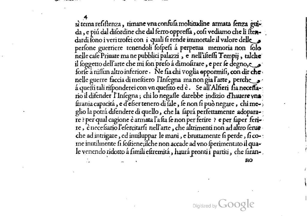 si tema resistenza, rimane una confusa moltitudine armata senza guida, e più dal disordine che dal ferro oppressa, cosi vediamo che li stendardi sono i veri trofei con i quali si rende immortale i1 valore delle persone guerriere tenendoli sospesi a perpetua memoria non solo nelle case private ma nè pubblici palazzi e nellʼistessi tempi, talchè il soggetto dellʼarte che mi son preso a dimostrare è per se degno e forse a nissun altro inferiore. Né sia chi voglia oppormisi, con dir che nella guerra faceva di mestiero lʼ Insegna ma non già l'arte, perchè a questi tali risponderei con un quesito, ed è. Se allʼAlfiere sia necessario il difendere l'Insegna, chi lo negasse darebbe indizio d'avere una strana capacità, e d'esser tenero di sale, se non si può negare chi meglio lo potrà difendere di quello che la saprà perfettamente adoperare? Per quale cagione è armata l'asta se no nper ferire? e per saper ferire è necessario esercitarsi nellʼ arte, che altrimenti non ad altro serve che ad intrigare ed inviluppare le mani, e bruttamente si perde, si come inutilmente si sostiene;il che non accade ad uno sperimentato il quale venendo ridotto a simili estremità avrà pronti i partiti che saran-