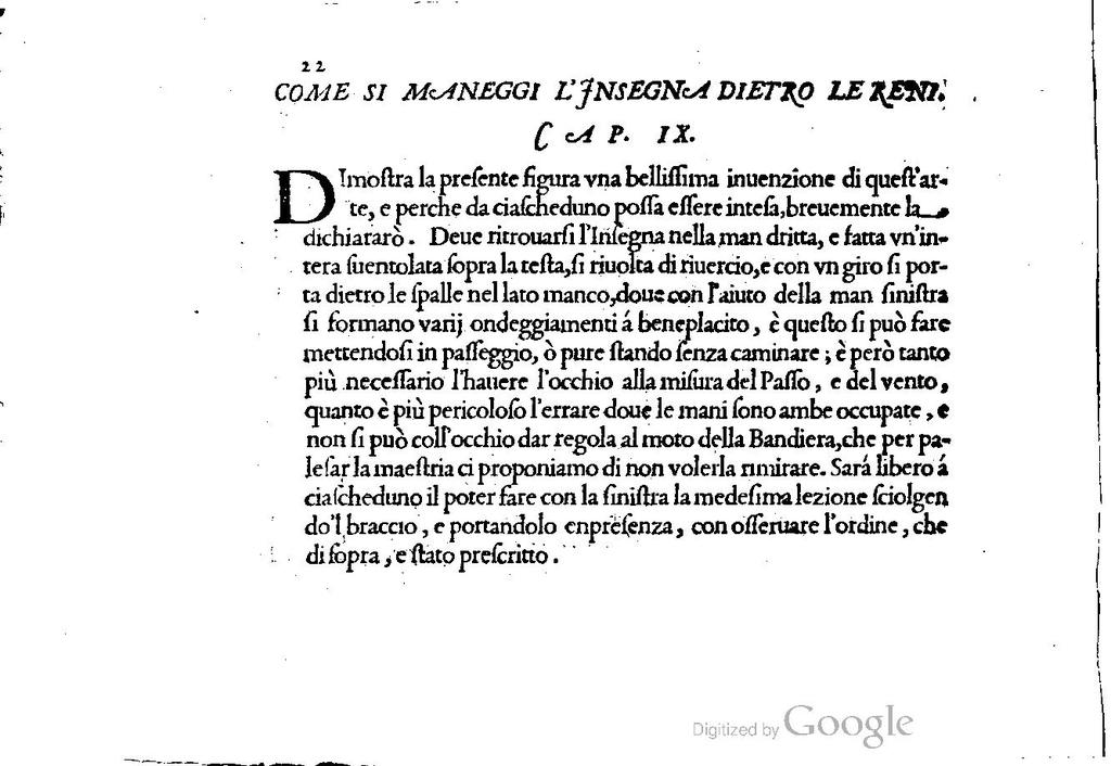 Dimostra la presente figura una bellissima invenzione di questʼarte, e perché da ciascheduno possa essere intesa, brevemente la dichiararò. Deve ritrovarsi lʼinsegna nella man dritta, e fatta unʼintera sventolata sopra la testa, si rivolta di rivercio e con un giro si porta dietro le spalle nel lato manco, dove con lʼaiuto della man sinistra si formano vari ondeggiamenti a beneplacito, e questo si può far mettendosi in passeggio, o pure stando senza camminare; è però tanto più necessario lʼavere lʼocchio alla misura del passo, e del vento, quanto è più pericolo lʼerrore dove le mani sono ambe occupate, e non si può collʼocchio dar regola al moto della Bandiera, che per palesar la maestria ci proponiamo di non voler rimirare. Sarà libero a ciascheduno il poter fare con la sinistra la medisima lezione sciogliendo il braccio e portandolo en preferenza, con osservare lʼordine che di sopra è stato prescritto.