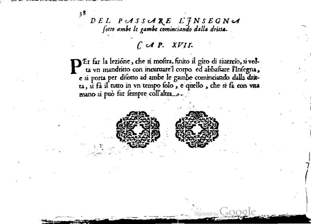 Per far la lezione che si mostra, finito il giro di rivercio, si volta un mandritto con incurvare il corpo ed abbassare lʼinsegna, e si porta per di sotto ad ambe le gambe cominciando dalla dritta, si fà tutto in un tempo solo, e quello che si fà con una mano si può fare sempre con lʼaltra.