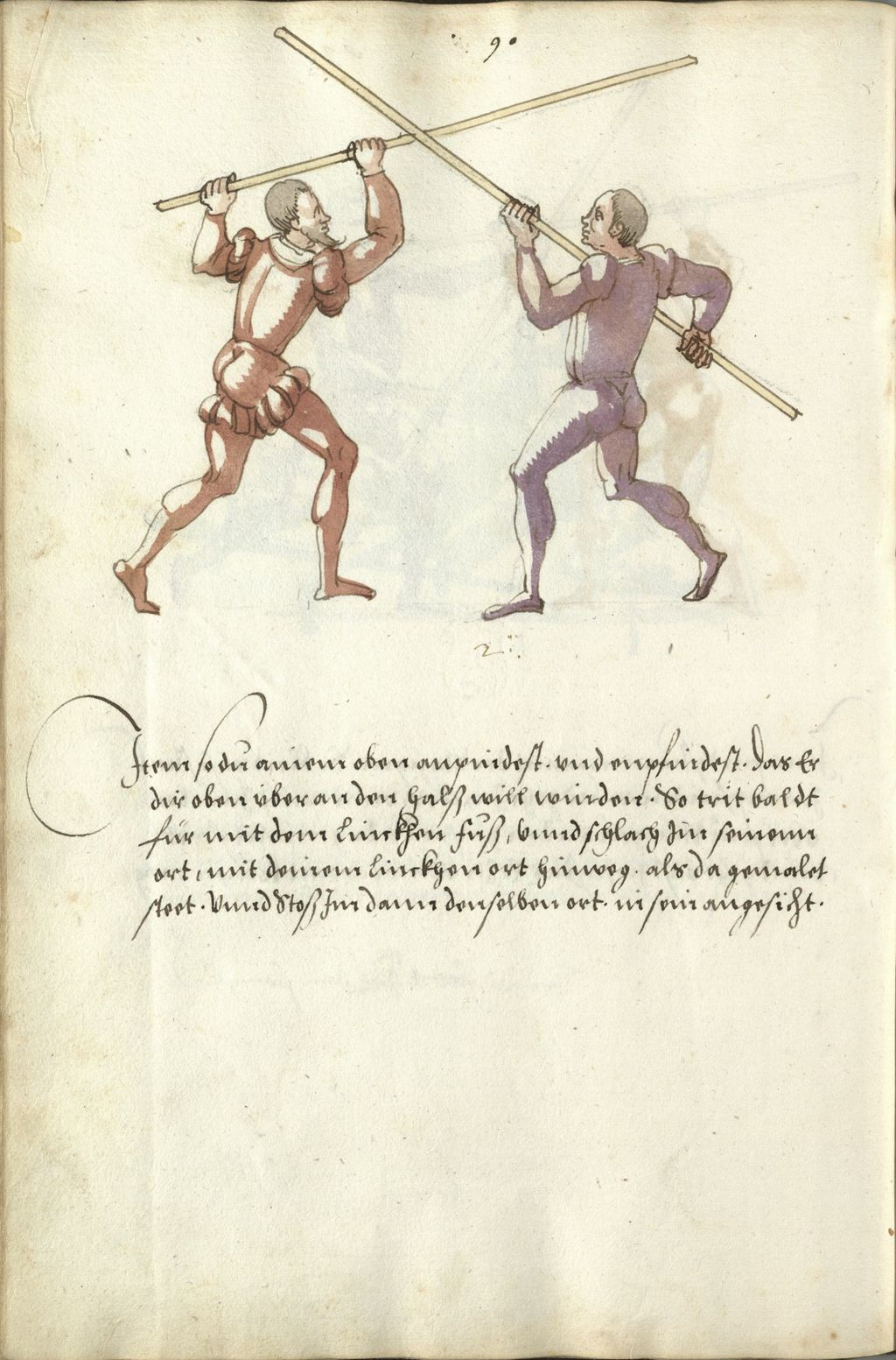 Item so du ainem oben anpindest. vnd enpfindest. das Er dir oben vber an den halß will winden. so trit baldt für mit dem linckhen fuß. vnnd schlach jm seinenn ort. mit deinem linckhen ort hinweg. als da gemalet steet. vnnd stoß Im dann denselben ort in sein angesicht.