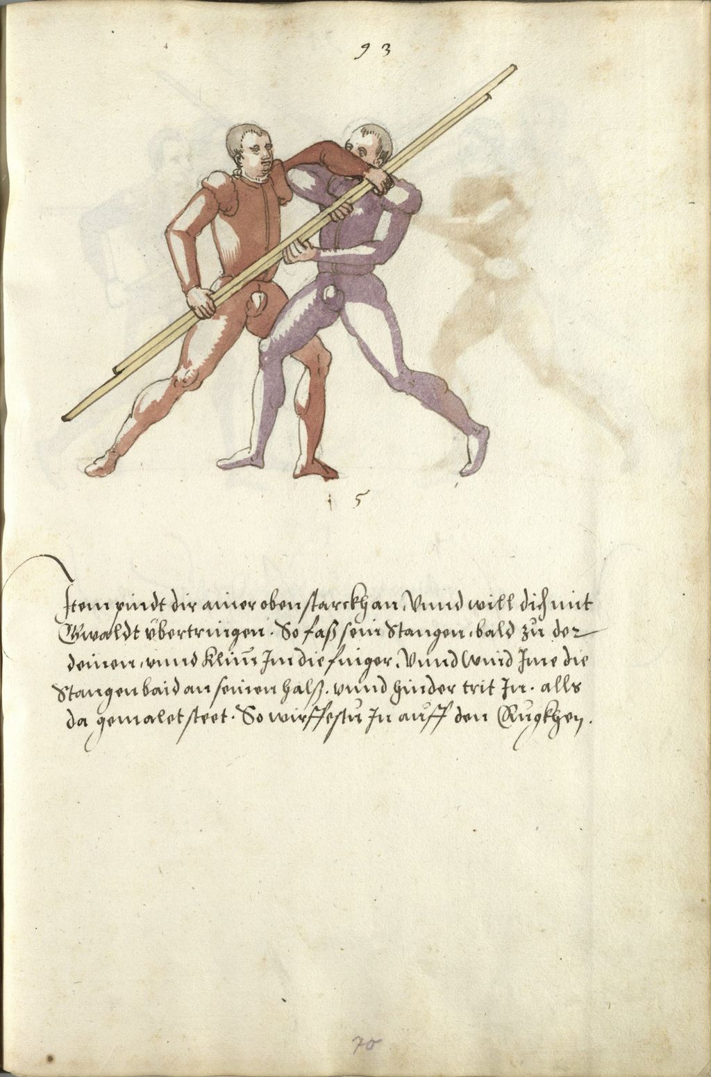 Item pindt dir ainer oben starckh an. vnnd will dich mit Gwaldt vbertringen. so faß sein stangen. bald zu der deinen. vnnd klim Im die finger. vnnd wind Ime die stangen baid an seinen halß. wind hinder trit In. alls da gemalet steet. so wirffestu In auff den Ruckhen.