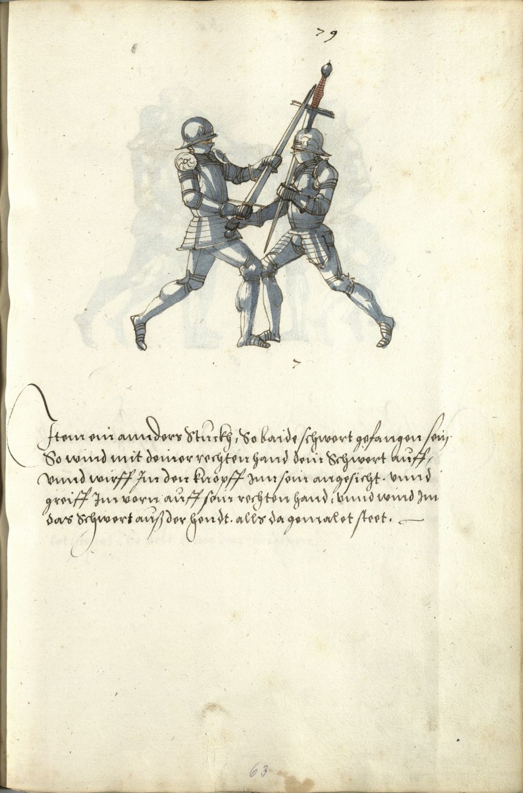 Item ain annders stuckh. so baide schwert gefangen sei(n) so wind mit deiner rechten hand dein schwert auff. vnnd wirff Im den knopff jnn sein angesicht. vnnd greiff jm vorn auff sein rechten hand. vnnd wind jm das schwert auß der handt. alls da gemalet steet. ~