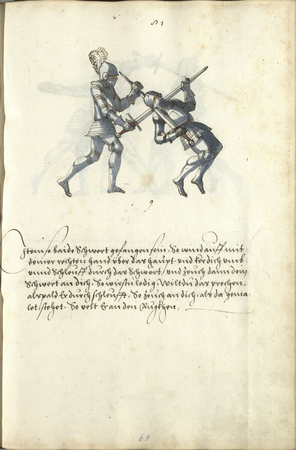 Item so baide schwert gefangen sein. so wind auff mit deiner rechten hand vber das haupt vnd ker dich vmb vnnd schleuff durch das schwert vnd zeuch dann dei(n) schwert an dich. so wirstu ledig. wiltdu das prechen. alspald er durch schleufft. so zeuch an dich. als da gemalet stehet. wo velt er an [sic] de[n] rugkhen. ~