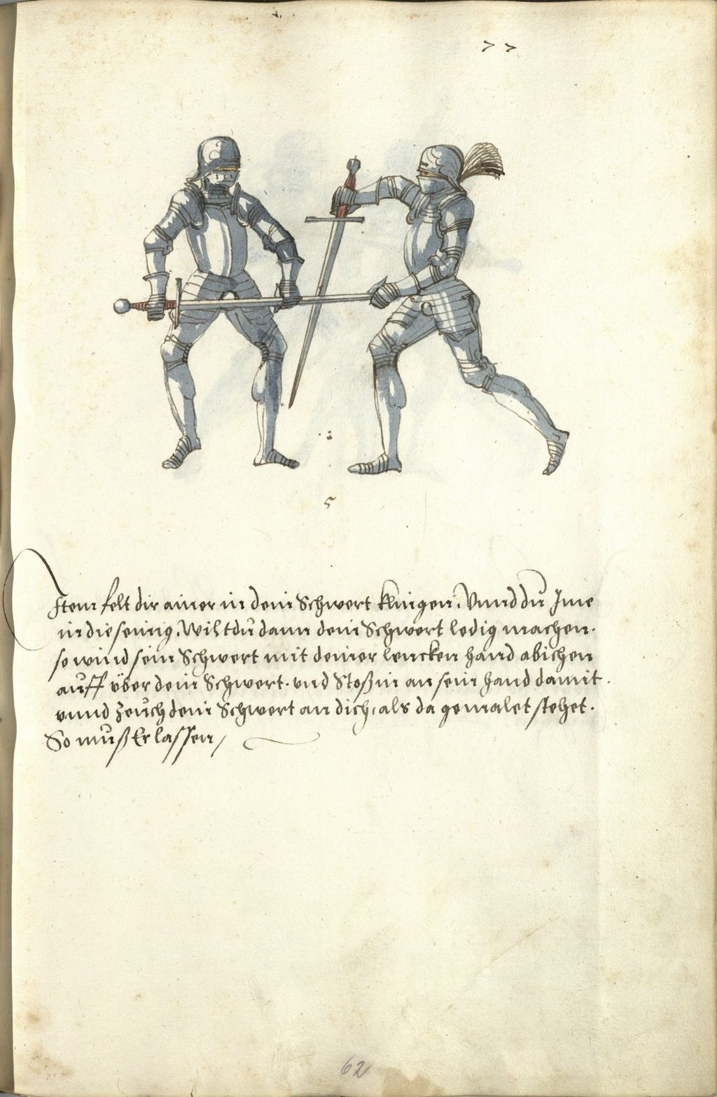 Item felt dir ainer in dein schwert klingen. vnnd du jme in die seinig. wiltdu dann dein schwert ledig machen so wind sein schwert mit deiner lencken hand abichen auff vber dein schwert. vnd stoß in an sein hand damit vnnd zeuch dein schwert an dich. als da gemalet stehet. so muß er lassen. ~