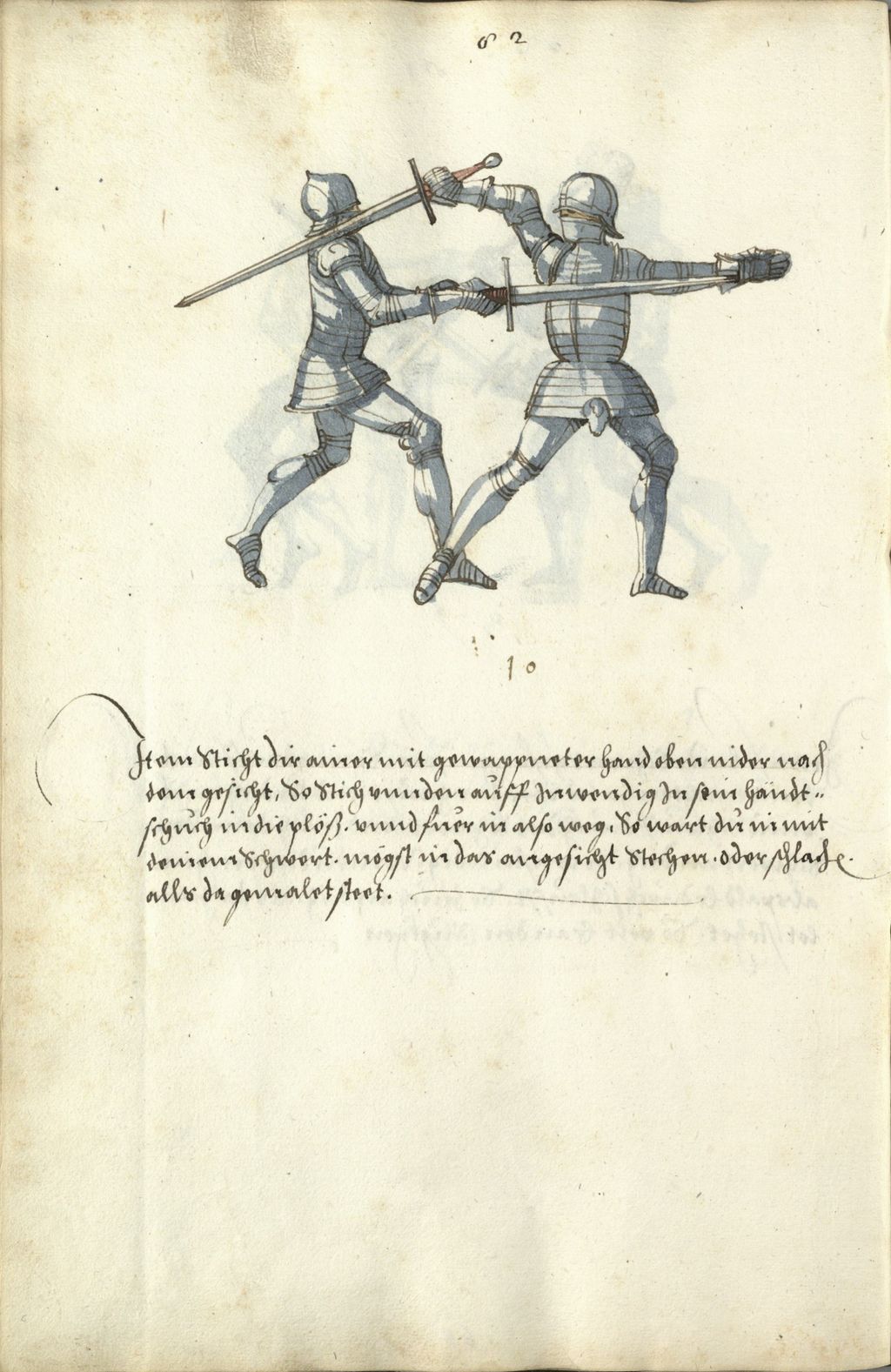 Item sticht dir ainer mit gewappneter hand ob nider nach dem gesicht. so stich vnnden auff jnwendig jn sein handt. schu[ch] in die plöß. vnnd fuer in also weg. so wart du in mit deinem schwert. m[ö]gst in das angesicht stechen oder schlach(en) alls da geamalet steet. ~
