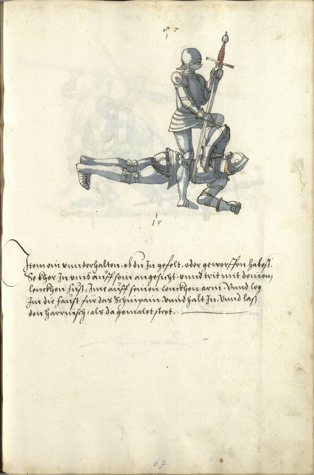 Item ain vnderhalten. ob du In gefelt. oder geworffen habest so kher In vmb auff sein angesicht. vnnd trit mit deinem lenckhen fuß. Ime auff seinen lenckhen arm. vnnd leg Im die faust fur das schinpain. vnnd halt In. vnnd laß den harrnisch als da gemalet steet. ~