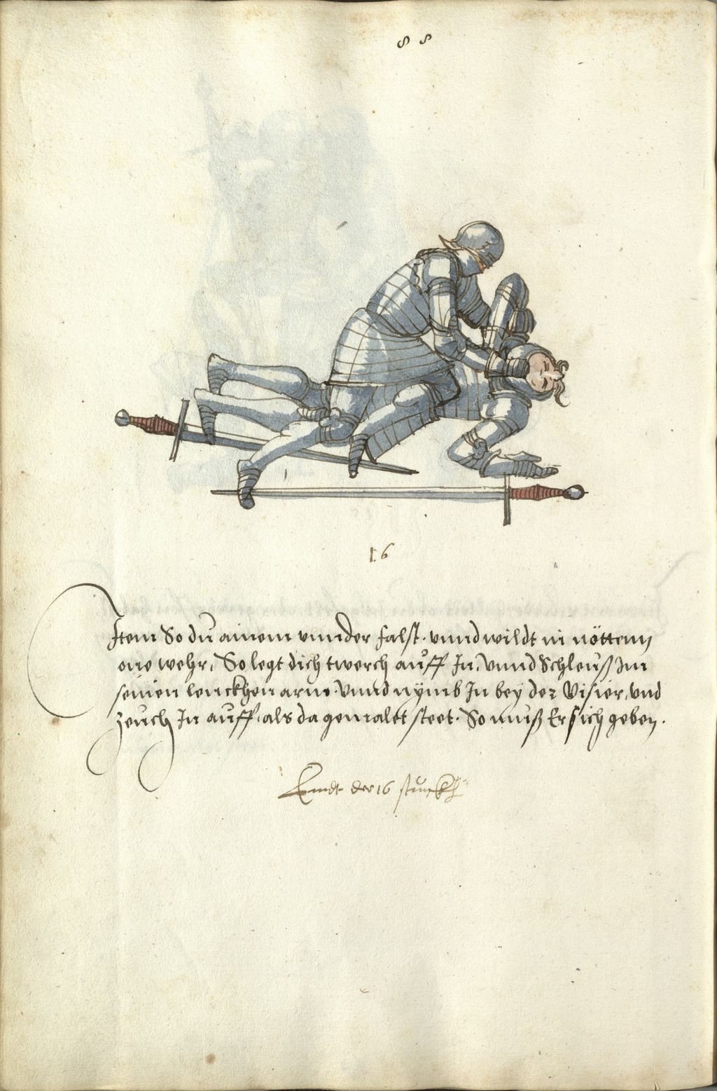 Item so du ainem vnder halst vnnd wildt in [nötte(nn)] one wehr. so legt dich twerch auff. In vnnd schleuß jm seinen lenckhen arm. vnnd nymb in bey der [visier] vnd zeuch In auff als da gemalet steet. so muß er sich geben.