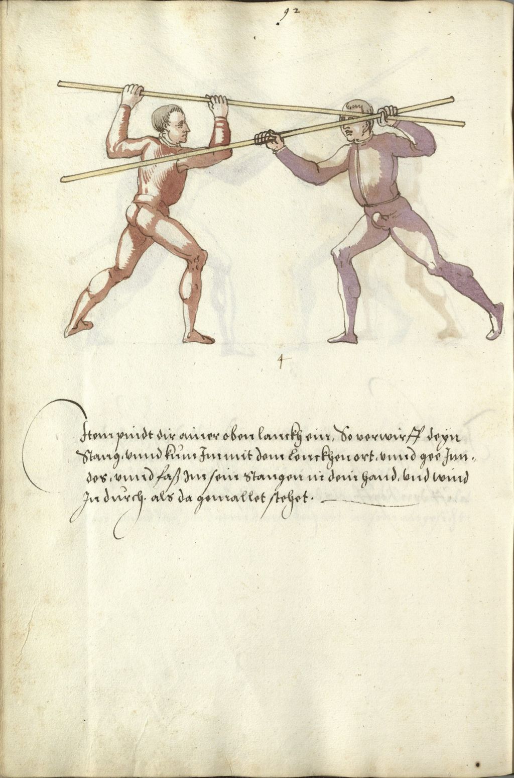 Item pindt dir ainer oben lanckh ein. so verwirff deyn stang. vnnd kum Im mit dem lenckhen ort. vnnd gee Inn. des. vnnd faß jm sein stangen in dein hand. vnd wind Jn durch. als da gemallet stehet. ~