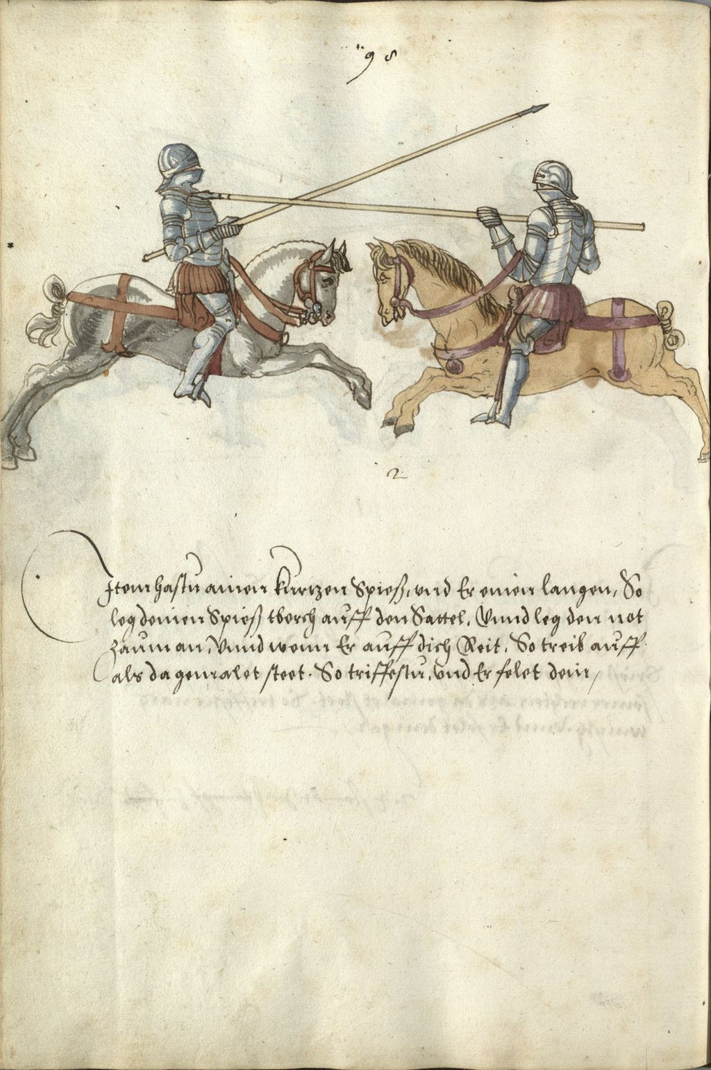 Item hastu ainen kurczen spieß. vnd er ainen langen. so leg einen spieß tberch auff den sattel. vnnd leg den not zaum an. vndd wenn er auff dich reit. so treib auff als da gemalet steet. so triffestu. vnd er felet dein.