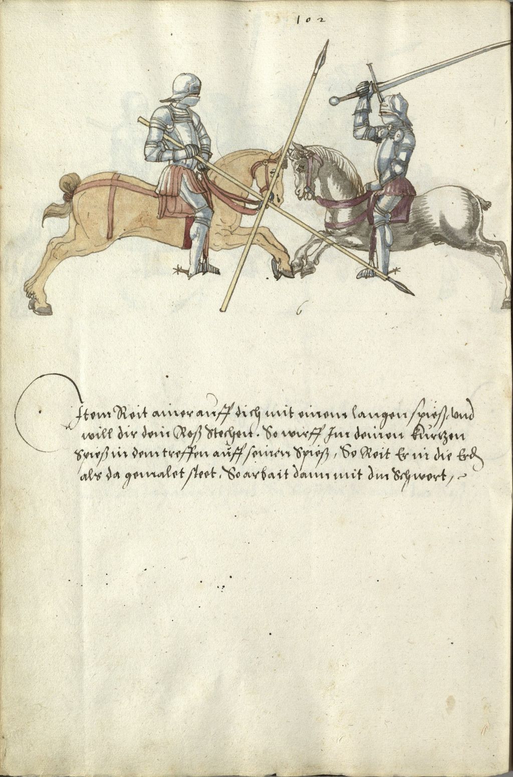 Item reit ainer auff dich mit ainem langen spieß vnd will dir dein Roß stechen. so wirff Im dienen kurczen spieß in dem treffen auff seinen spieß. so reit er in die erd(en) als da gemalet steet. so arbait dann mit dm[1] schwert.
