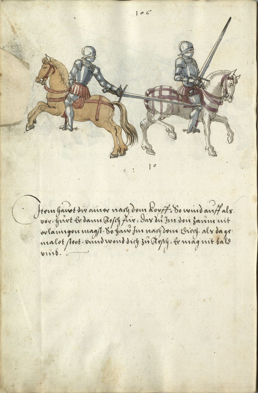 Item hawt dir ainer nach dem kopff. so wind auff als vor. hurt er dann resch fur. das du Im den zaum nit erlanngen mags. so haw Im nach dem [dierh] als da gemalet steet. vnnd wend dich zu resch. er mag nit bald vmb. ~