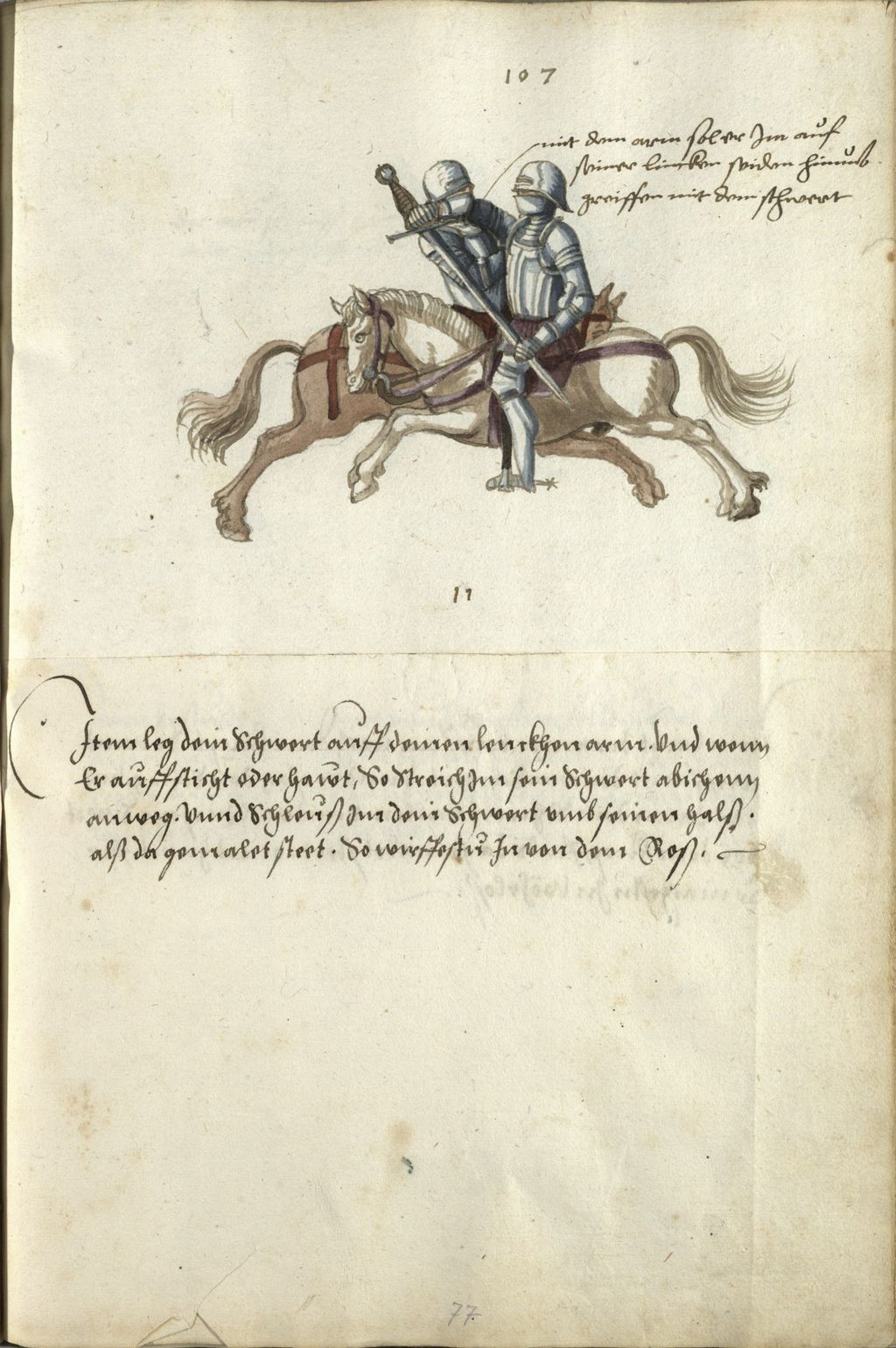 Item leg dein schwert auff deinen lenckhen arm. vnd wen(n) er auff sticht oder hawt. so straich Im sein schwert abichen(n) anweg. vnnd schleuß jm dein schwert vmb seinen halß. alß da gemalet steet. so wirffestu In von dem Roß. ~