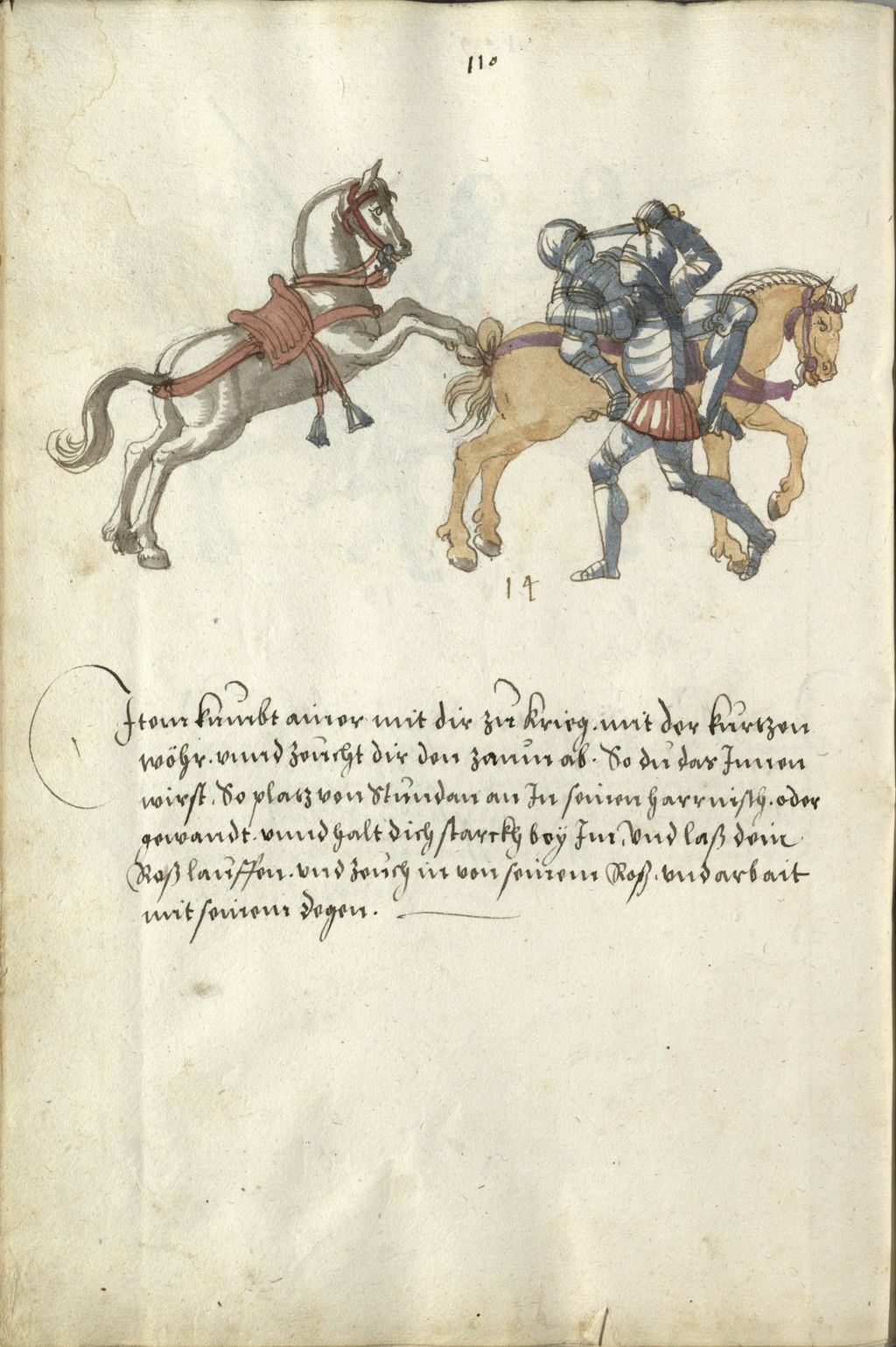 Item kumbt ainer mit dir zu krieg. mit der kurczen wöhr. vnnd zeucht dir den zaum ab. so du das Innen wirst. so placz von stundan an In seinen harrnisch. oder gewandt. vnnd halt dich starckh bey Im. vnd laß dein Roß lauffen. vnd zeuch in von seinem Roß vnd arbait mit seinem Degen. ~