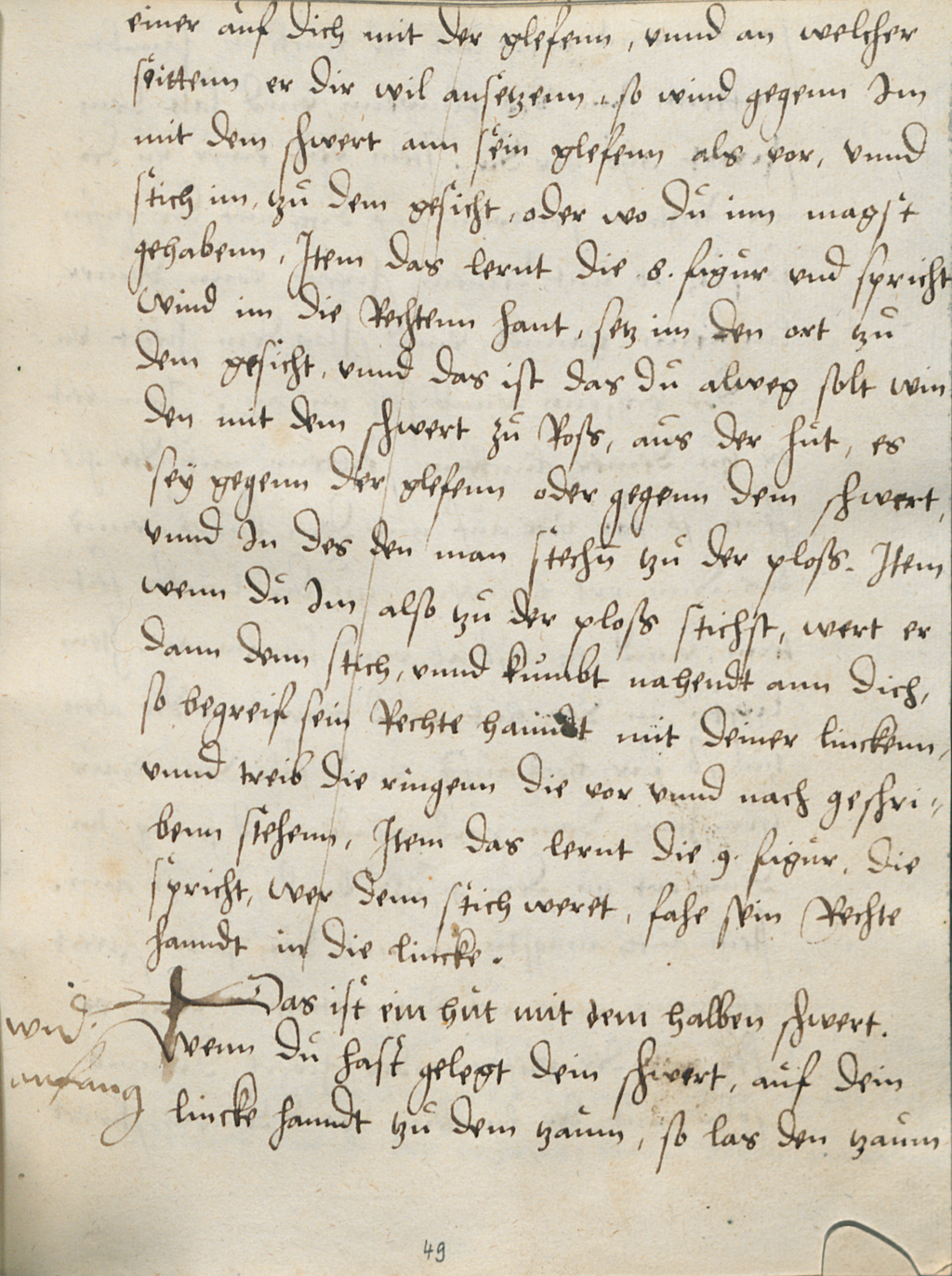 einer auf dich mit der glefenn, vnnd an welcher seittenn er dir wil ansetzenn, so wind gegenn Im mit dem schwert ann sein glefenn als vor, vnnd stich im, tzu dem gesicht, oder wo du inn magst gehaben.