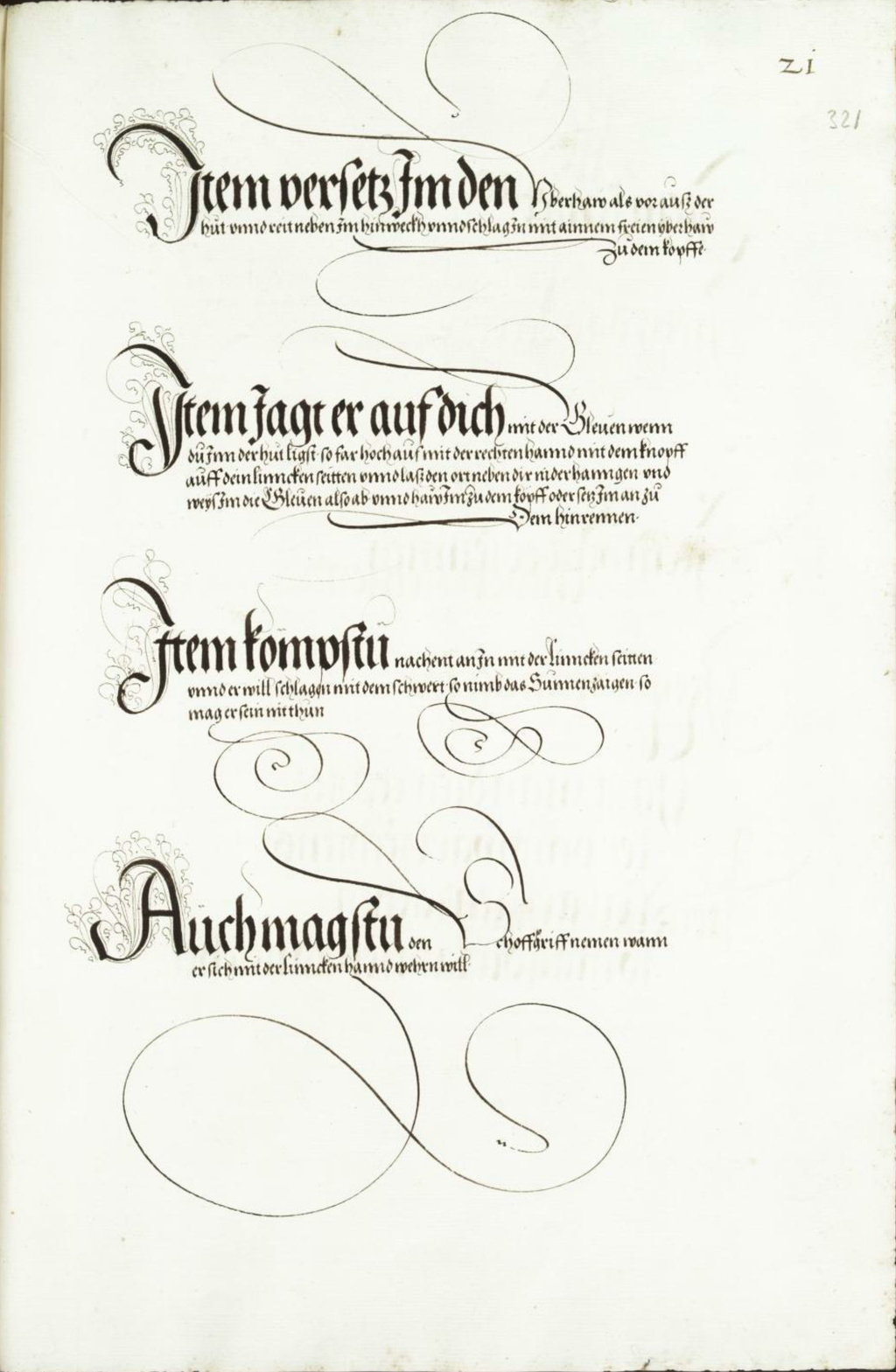 Item versetz Im den Uberhaw als vor auß der hut unnd reit neben Im hinweckh unnd schlag In mit ainnem freien uberhaw ~ Zu dem kopffe.