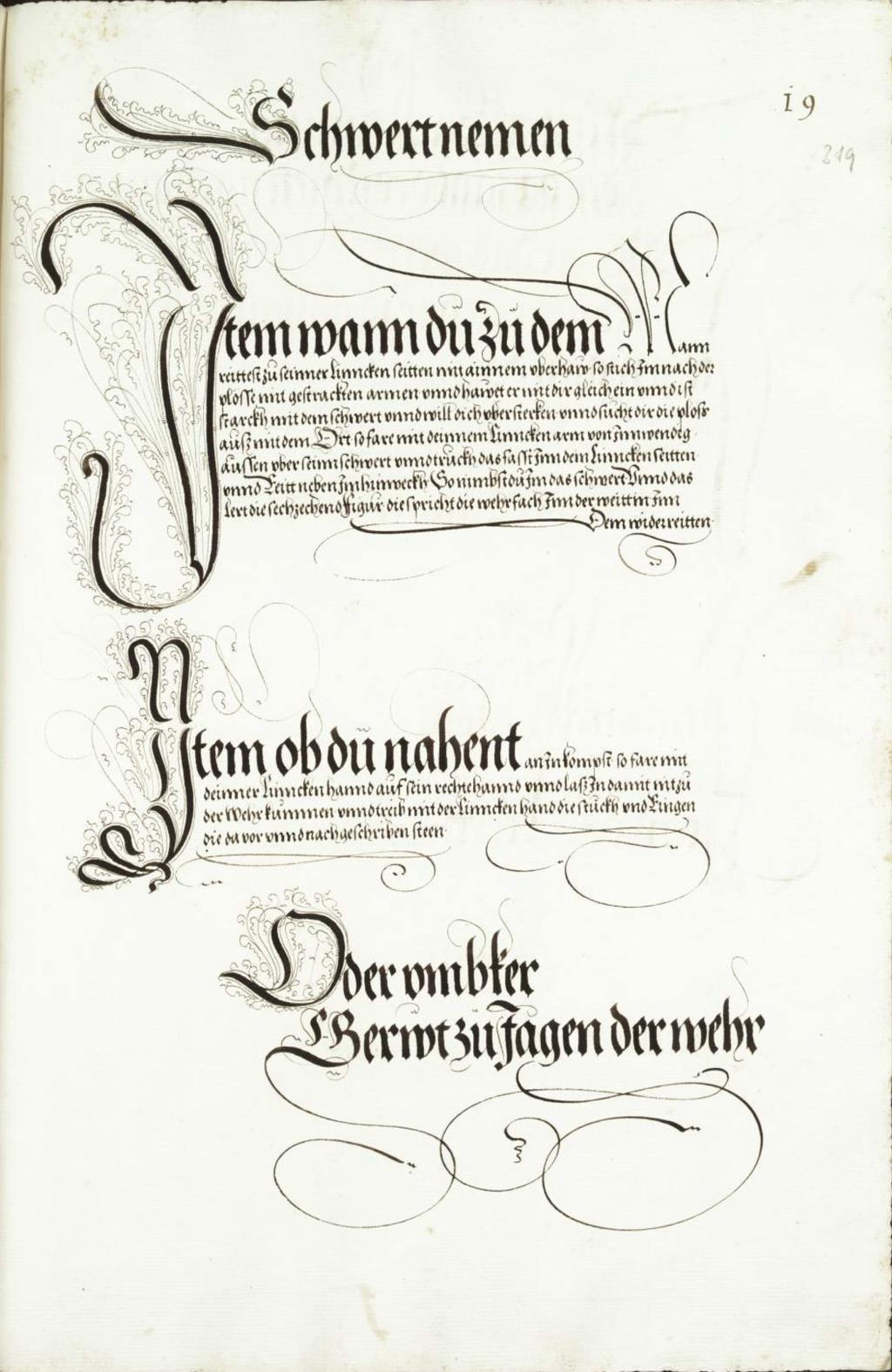 Item ob du nahent an In kompst, so far mit deinner linncken hannd auf sein rechte hannd unnd laß In damit nit zu der Wehr kummen unnd treib mit der linncken hand die stuckh und Ringen die da vor unnd nach geschriben steen.