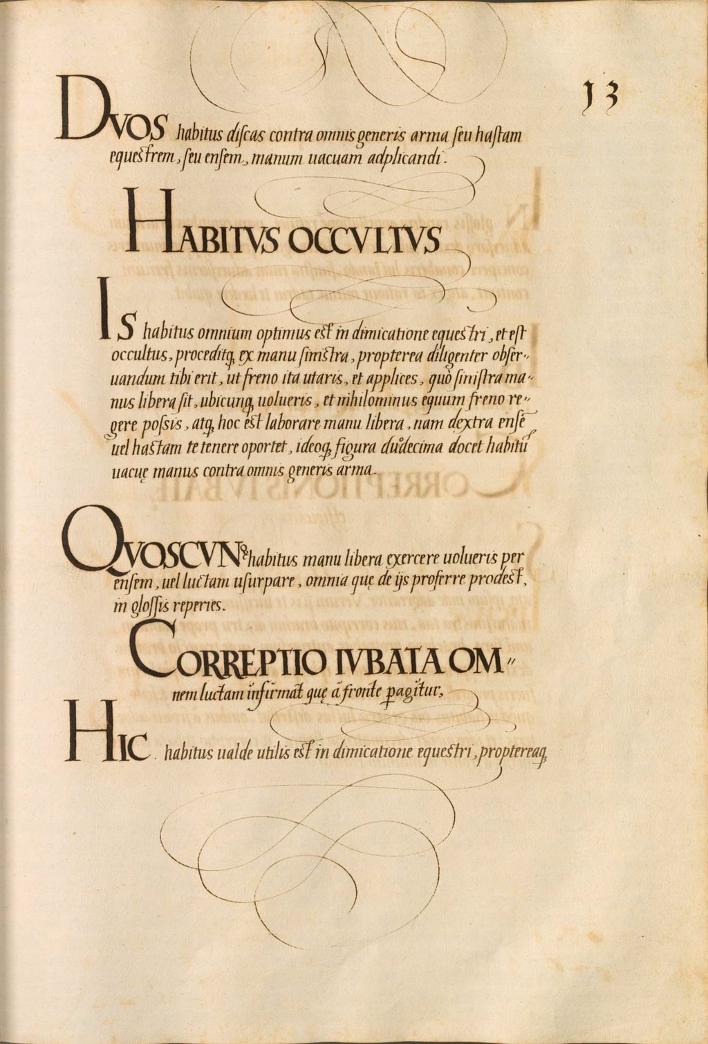 Is habitus omnium optimus est in dimicatione equestri, et est occultus, proceditque ex manu sinistra, propterea diligenter observandum tibi erit, ut freno ita utaris, et applices, quo sinistra manus libera sit, ubicunque volueris, et nihilominus equum freno regere possis, atque hoc est laborare manu libera,