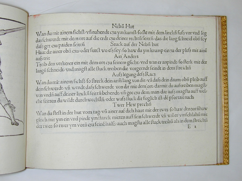 Wan du mit ainem fichst, so streck dein armm lang von dir, und daß dein daum oben pleib auff dem schwerdt, und wendt daß schwerdt von dir mit dem ort, darmit du auftreiben magst, von unden auff deiner lincken seitten behendt, und gee czu dem man, dar auß magstu auff welche seitten du wildt durchwechslen, oder waß stuck dir fuglich ist, den pfortail nach