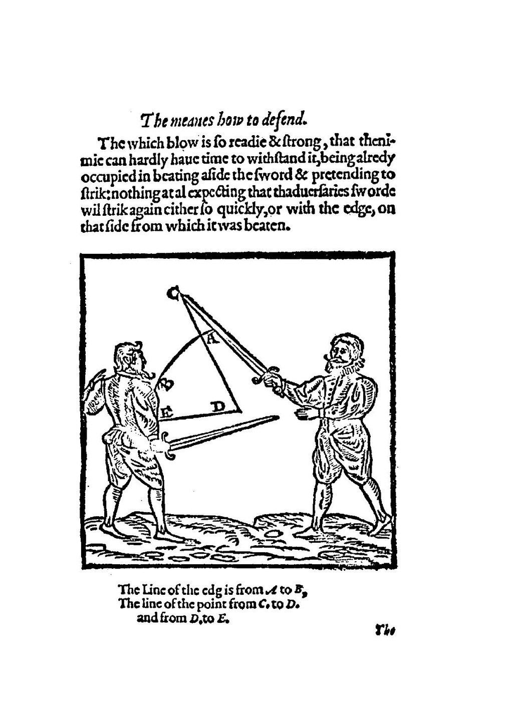 The which blow is so readie & strong, that thenimie can hardly haue time to withstand it, being alredy occupied in beating aside the sword & pretending to strik: nothing at al expecting that thaduersaries sworde wil strik again either so quickly, or with the edge, on that side from which it was beaten.