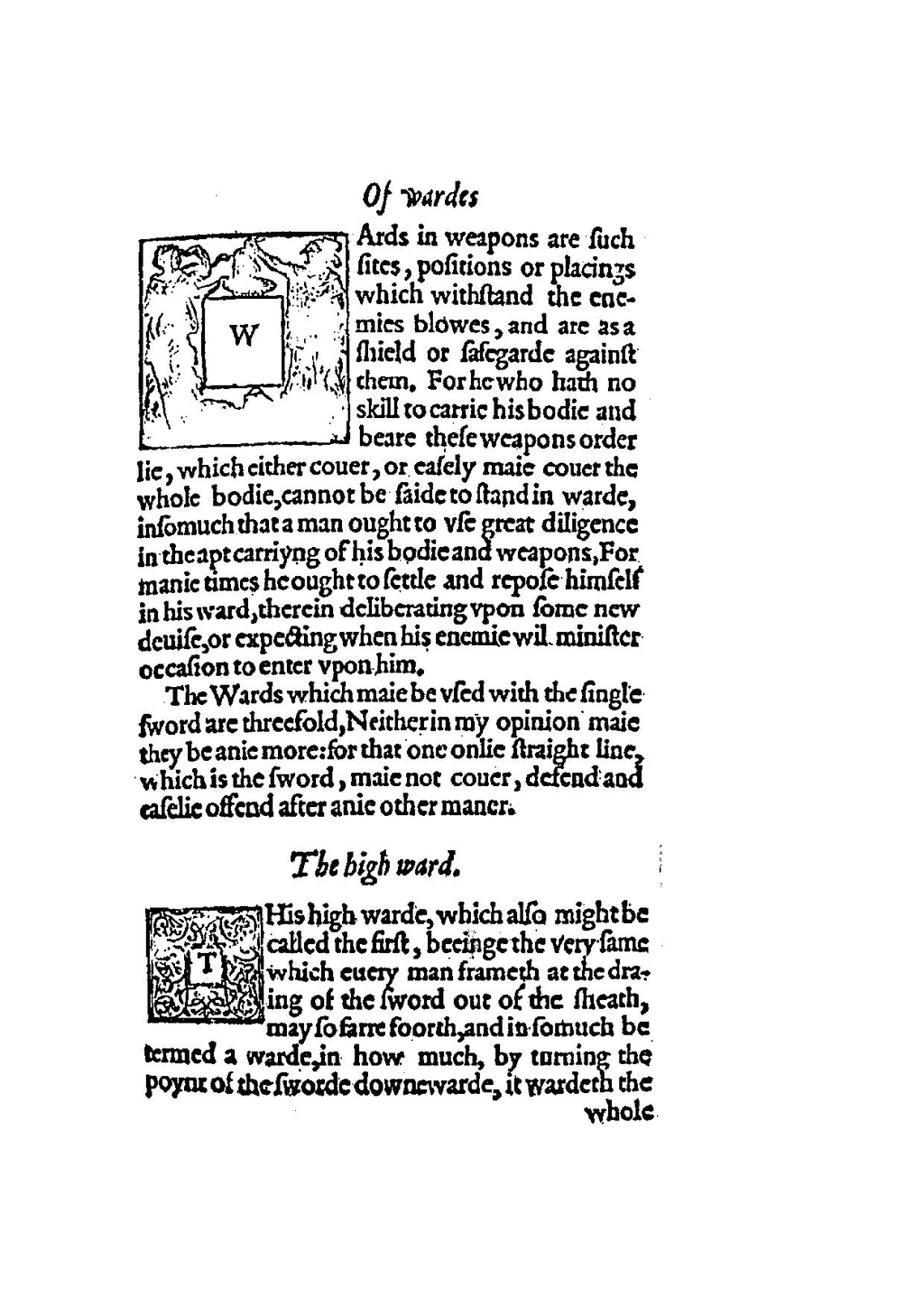 WArds in weapons are such sites, positions or placings which withstand the enemies blowes, and are as a shield or safegarde against them. For he who hath no skill to carrie his bodie and beare these weapons order lie, which either couer, or easely maie couer the whole bodie, cannot be saide to stand in warde, insomuch that a man ought to vse great diligence in the apt carriyng of his bodie and weapons, For manie times he ought to settle and repose himself in his ward, therein deliberating vpon some new deuise, or expecting when his enemie wil minister occasion to enter vpon him.