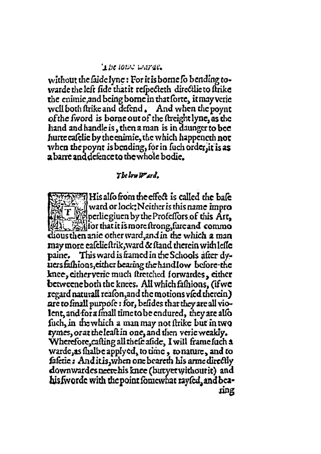 THis also from the effect is called the base ward or lock: Neither is this name improperlie giuen by the Professors of this Art, for that it is more strong, sure and commo dious then anie other ward, and in the which a man may more easelie strik, ward & stand therein with lesse paine. This ward is framed in the Schools after dyuers fashions, either bearing the hand low before the knee, either verie much stretched forwardes, either betweene both the knees. All which fashions, (if we regard naturall reason, and the motions vsed therein) are to small purpose: for, besides that they are all violent, and for a small time to be endured, they are also such, in the which a man may not strike but in two tymes, or at the least in one, and then verie weakly. Wherefore, casting all these aside, I will frame such a warde, as shalbe applyed, to time, to nature, and to safetie: And it is, when one beareth his arme directly downwardes neere his knee (but yet without it) and his sworde with the point somewhat raysed, and bea-ring