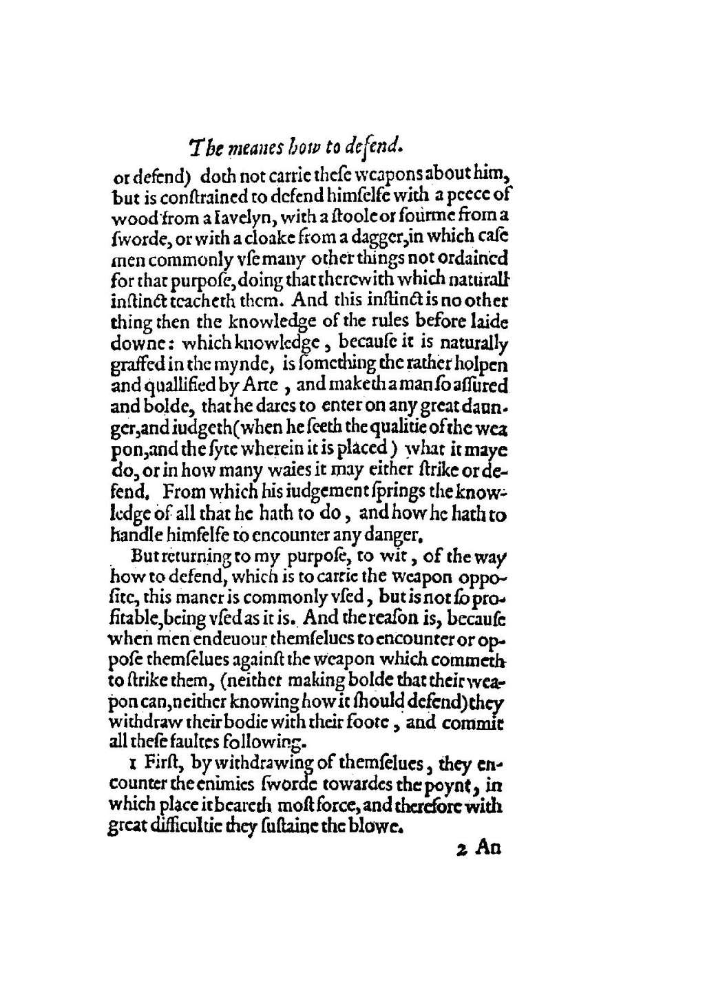 or defend) doth not carrie these weapons about him, but is constrained to defend himselfe with a peece of wood from a Iavelyn, with a stoole or fourme from a sworde, or with a cloake from a dagger, in which case men commonly vse many other things not ordained for that purpose, doing that therewith which naturall instinct teacheth them. And this instinct is no other thing then the knowledge of the rules before laide downe: which knowledge, because it is naturally graffed in the mynde, is something the rather holpen and quallified by Arte, and maketh a man so assured and bolde, that he dares to enter on any great daunger, and iudgeth (when he seeth the qualitie of the wea pon, and the syte wherein it is placed) what it maye do, or in how many waies it may either strike or defend. From which his iudgement springs the knowledge of all that he hath to do, and how he hath to handle himselfe to encounter any danger.