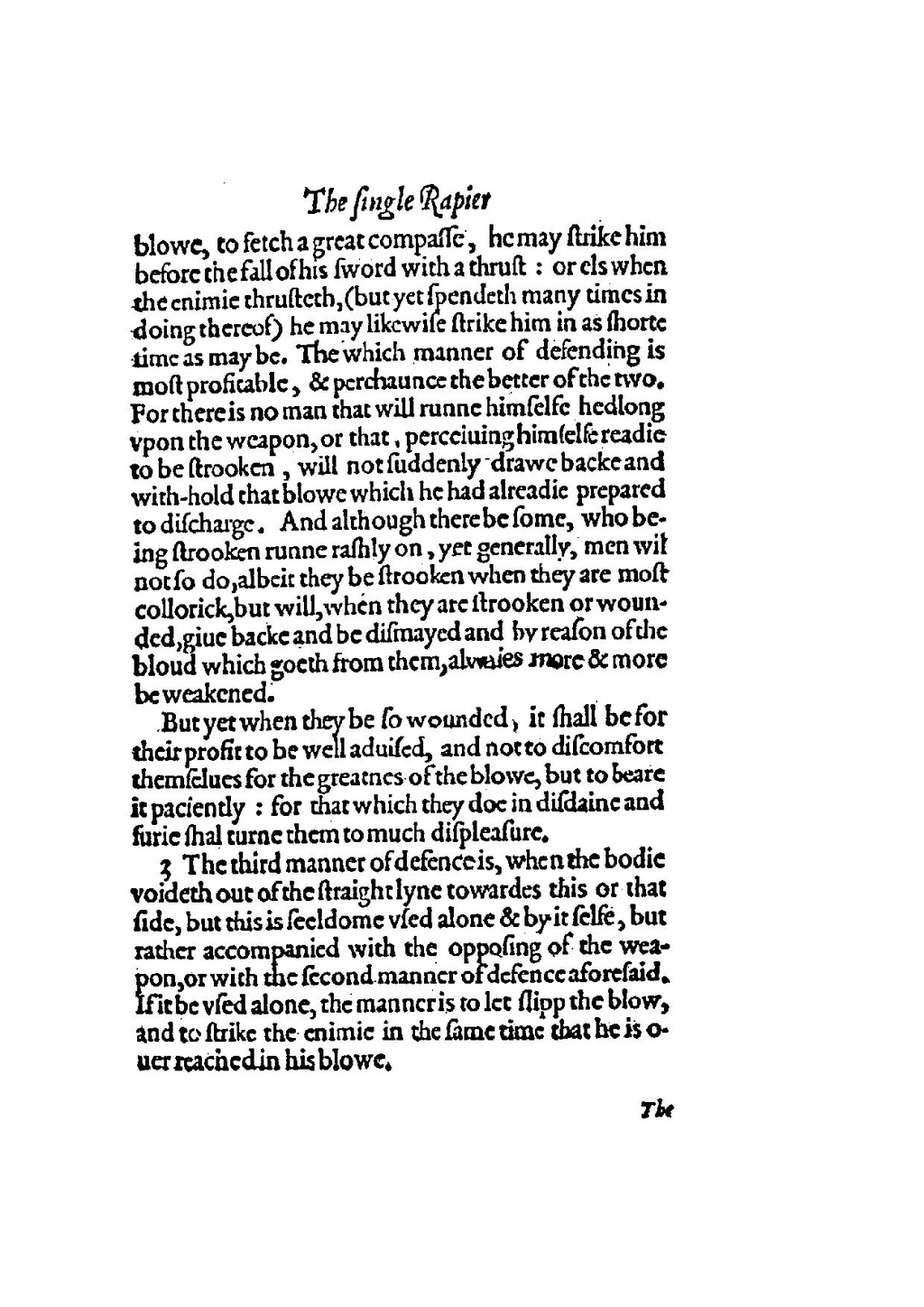 3 The third manner of defence is, when the bodie voideth out of the straight lyne towardes this or that side, but this is seeldome vsed alone & by it selfe, but rather accompanied with the opposing of the weapon, or with the second manner of defence aforesaid. If it be vsed alone, the manner is to let slipp the blow, and to strike the enimie in the same time that he is ouer reached in his blowe. The