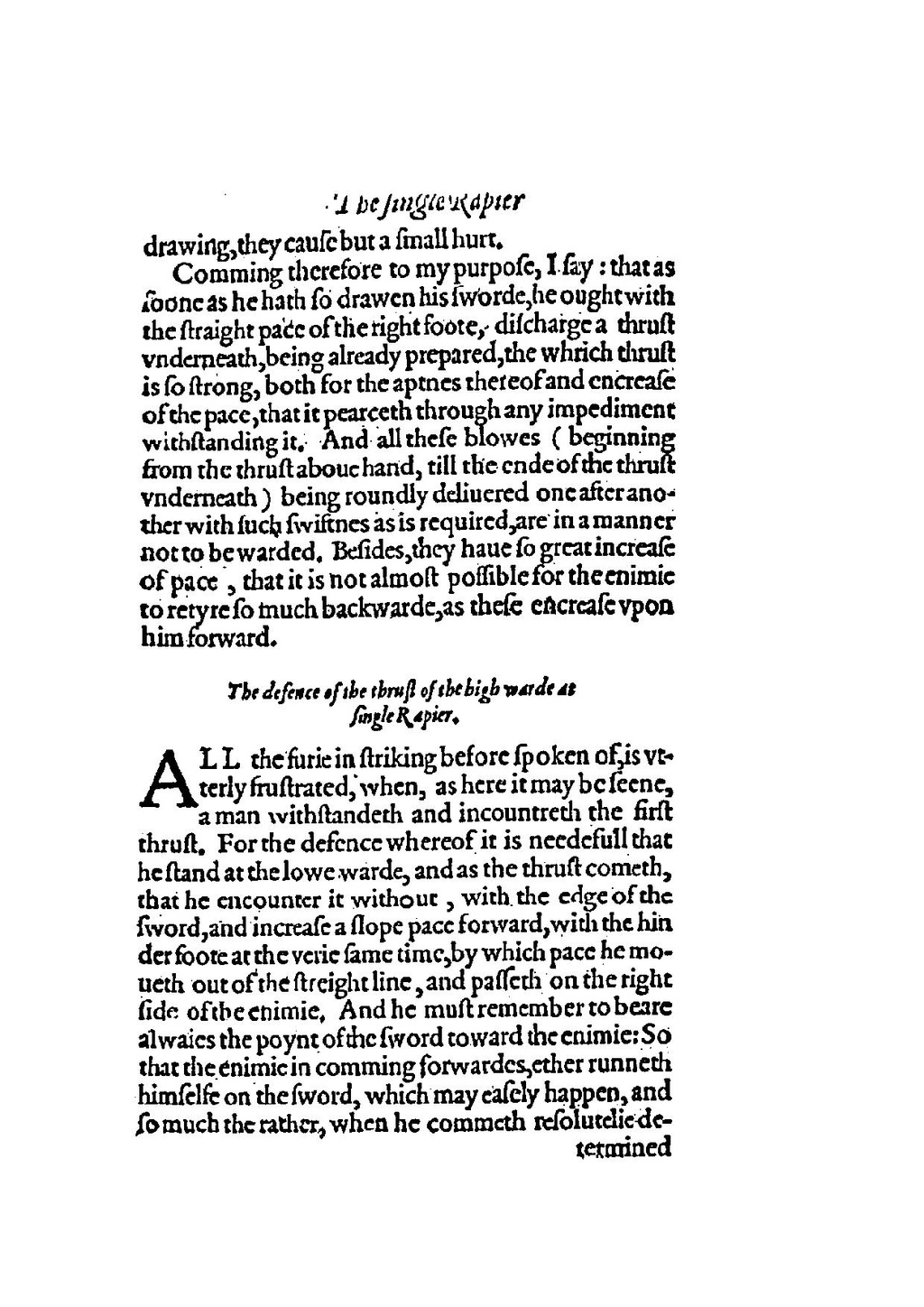 Comming therefore to my purpose, I say: that as soone as he hath so drawen his sworde, he ought with the straight pace of the right foote, discharge a thrust vnderneath, being already prepared, the whrich thrust is so strong, both for the aptnes thereof and encrease of the pace, that it pearceth through any impediment withstanding it. And all these blowes (beginning from the thrust aboue hand, till the ende of the thrust vnderneath) being roundly deliuered one after another with such swiftnes as is required, are in a manner not to be warded. Besides, they haue so great increase of pace, that it is not almost possible for the enimie to retyre so much backwarde, as these encrease vpon him forward.