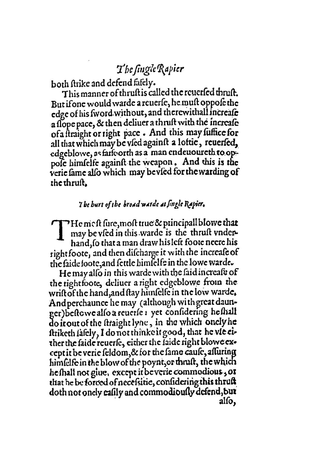 He may also in this warde with the said increase of the right foote, deliuer a right edgeblowe from the wrist of the hand, and stay himselfe in the low warde. And perchaunce he may (although with great daunger) bestowe also a reuerse: yet considering he shall do it out of the straight lyne, in the which onely he striketh safely, I do not thinke it good, that he vse either the saide reuerse, either the saide right blowe except it be verie seldom, & for the same cause, assuring himselfe in the blow of the poynt, or thrust, the which he shall not giue, except it be verie commodious, or that he be forced of necessitie, considering this thrust doth not onely easily and commodiously defend, but also,