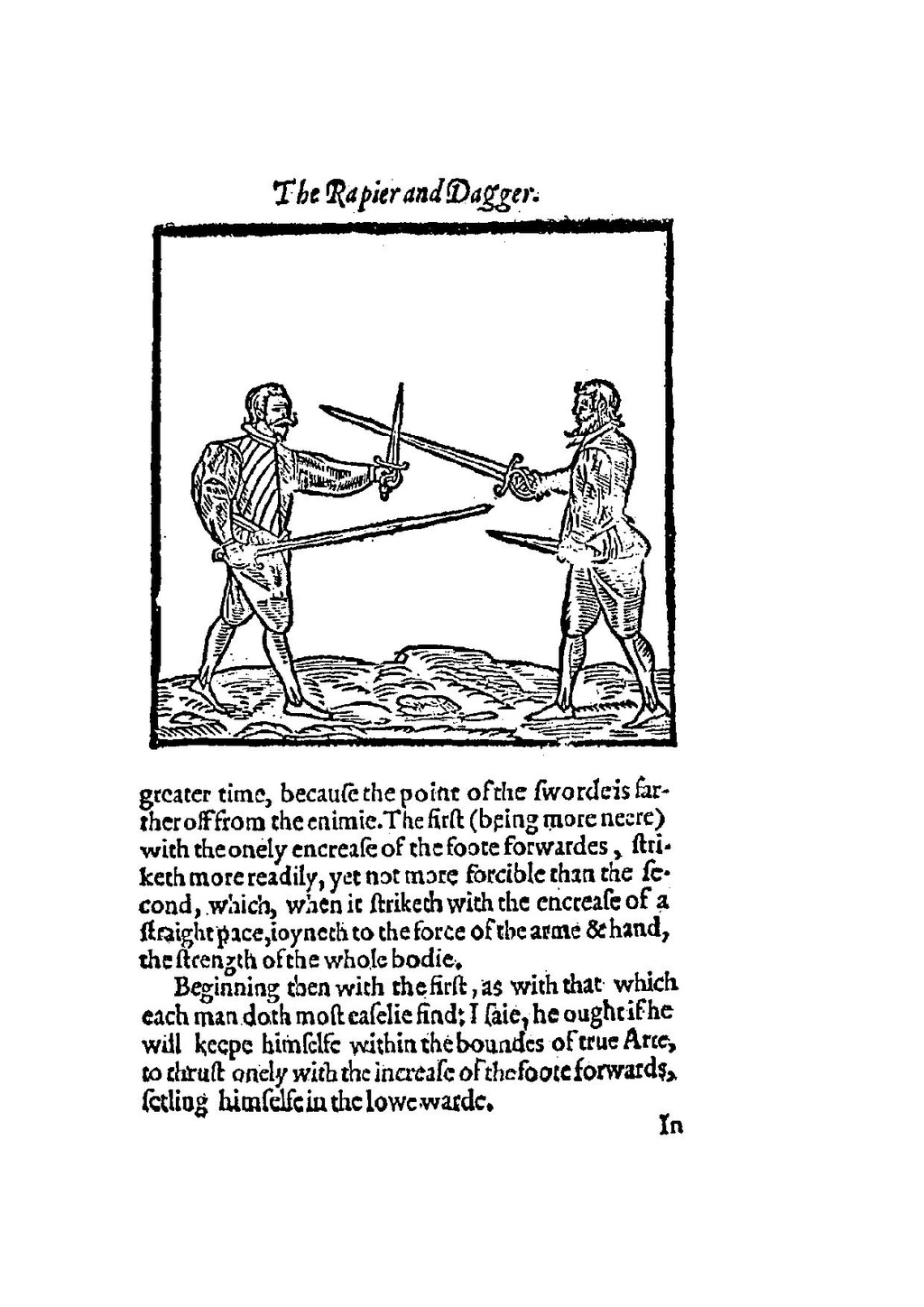 greater time, because the point of the sworde is farther off from the enimie. The first (being more neere) with the onely encrease of the foote forwardes, striketh more readily, yet not more forcible than the second, which, when it striketh with the encrease of a straight pace, ioyneth to the force of the arme & hand, the strength of the whole bodie.