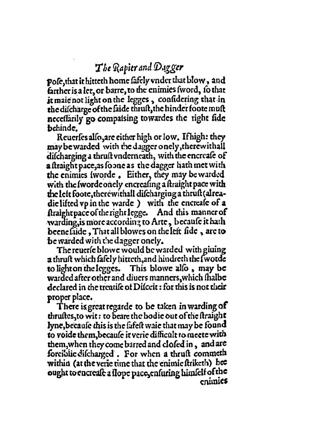 The reuerse blowe would be warded with giuing a thrust which safely hitteth, and hindreth the swotde to light on the legges. This blowe also, may be warded after other and diuers manners, which shalbe declared in the treatise of Disceit: for this is not their proper place.