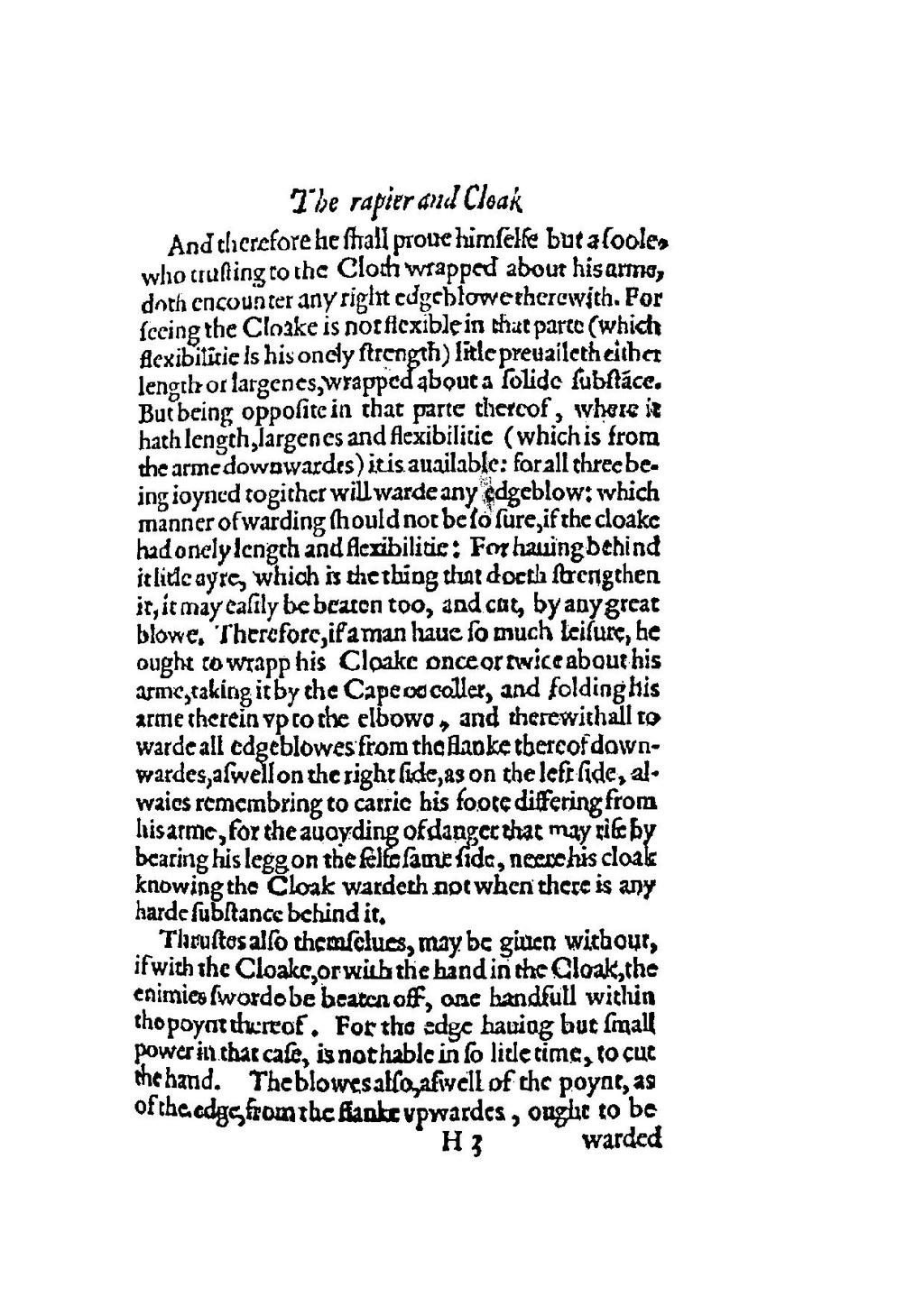 Thrustes also themselues, may be giuen without, if with the Cloake, or with the hand in the Cloak, the enimies sworde be beaten off, one handfull within the poynt thereof. For the edge hauing but small power in that case, is not hable in so litle time, to cut the hand. The blowes also, aswell of the poynt, as of the edge, from the slanke vpwardes, ought to be warded