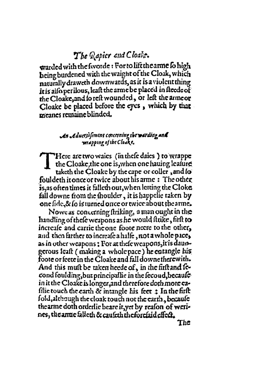 Nowe as concerning striking, a man ought in the handling of these weapons as he would strike, first to increase and carrie the one foote neere to the other, and then farther to increase a halfe, not a whole pace, as in other weapons: For at these weapons, it is daungerous least (making a whole pace) he entangle his foote or feete in the Cloake and fall downe therewith. And this must be taken heede of, in the first and second foulding, but principallie in the second, because in it the Cloake is longer, and therefore doth more easilie touch the earth & intangle his feet: In the first fold, although the cloak touch not the earth, because the arme doth orderlie beare it, yet by reason of werines, the arme falleth & causeth the foresaid effect. The