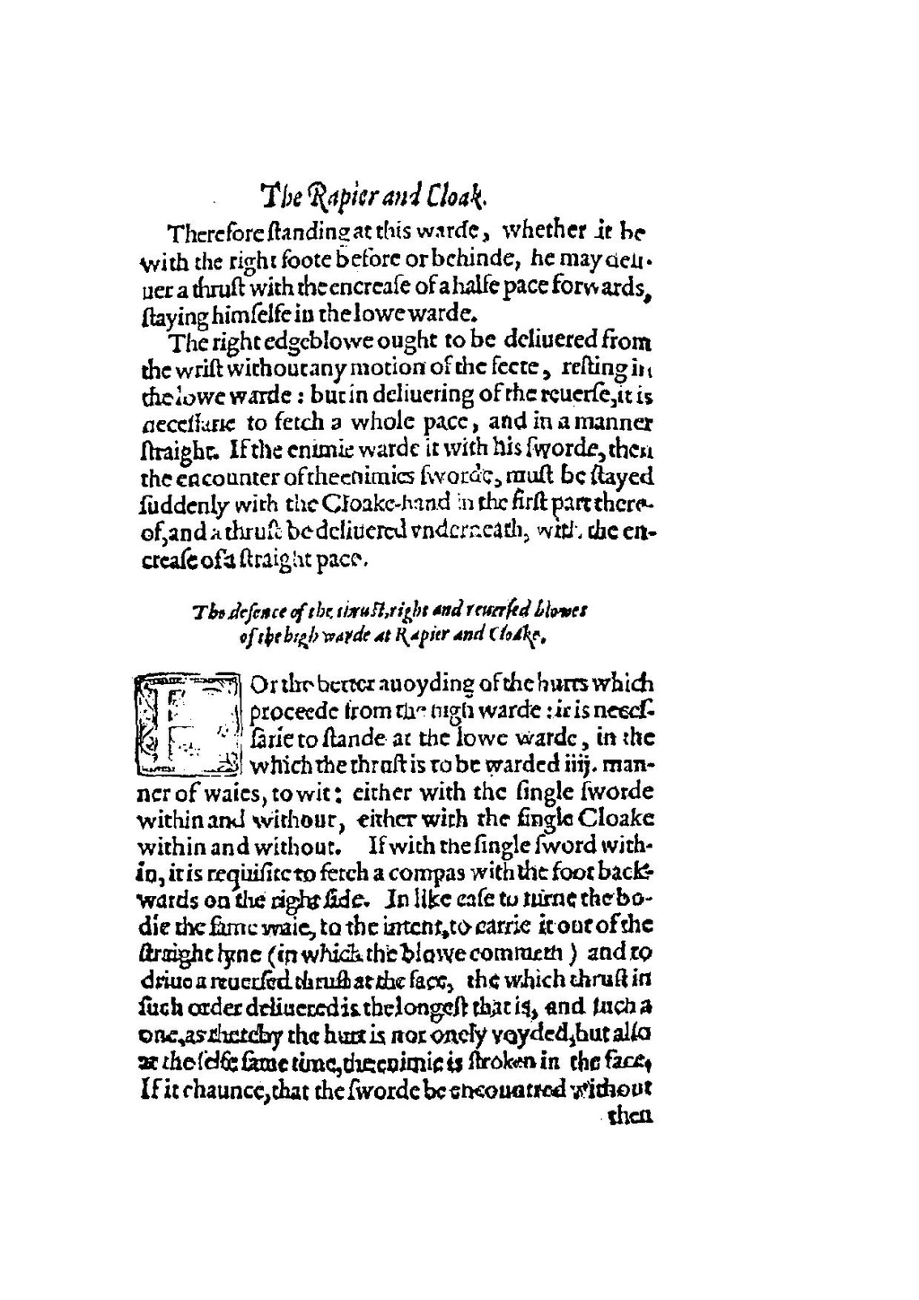 The right edgeblowe ought to be deliuered from the wrist without any motion of the feete, resting in the lowe warde: but in deliuering of the reuerse, it is necessarie to fetch a whole pace, and in a manner straight. If the enimie warde it with his sworde, then the encounter of the enimies sworde, must be stayed suddenly with the Cloake-hand in the first part thereof, and a thrust be deliuered vnderneath, with the encrease of a straight pace.