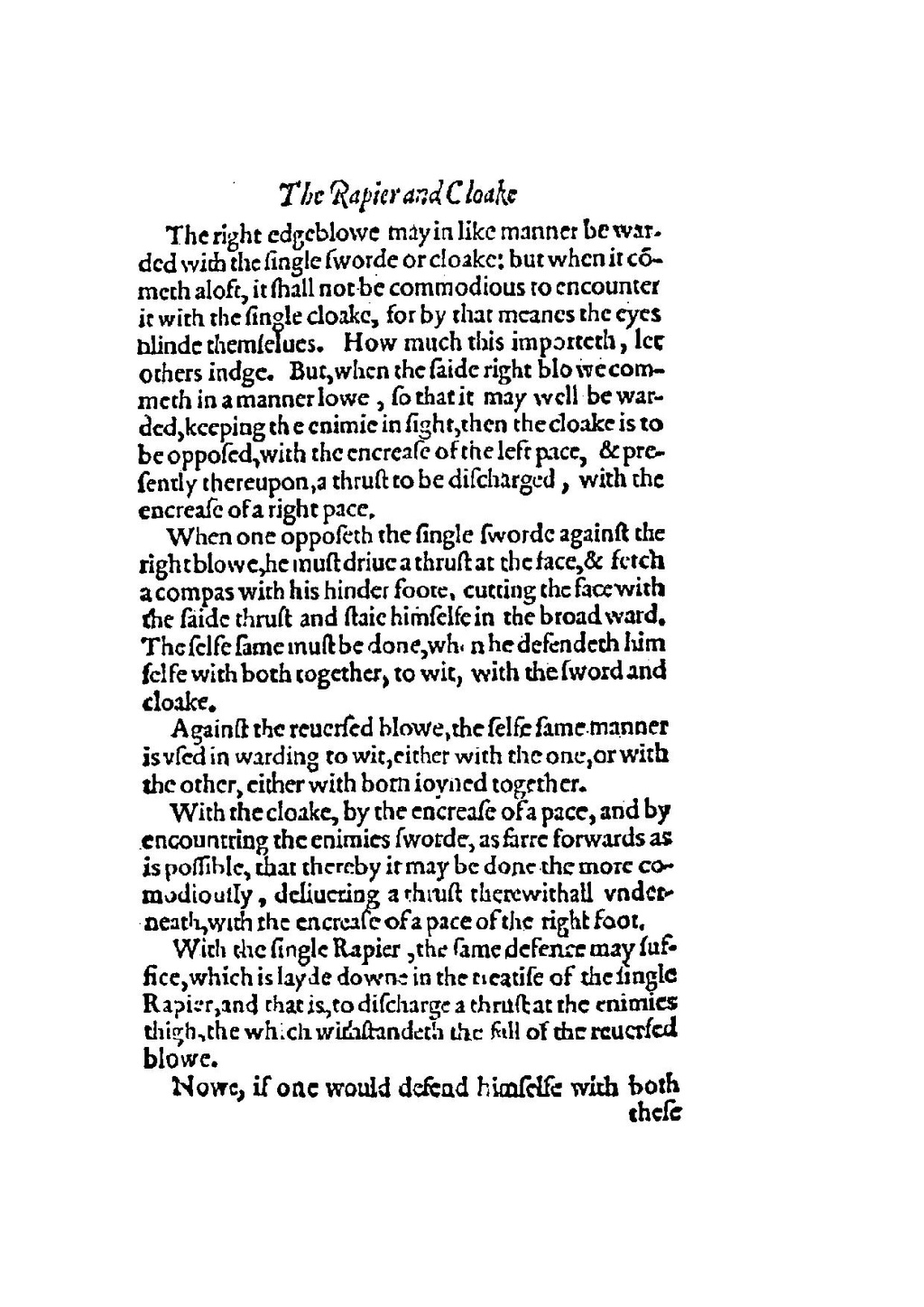 The right edgeblowe may in like manner be warded with the single sworde or cloake: but when it cōmeth aloft, it shall not be commodious to encounter it with the single cloake, for by that meanes the eyes blinde themselues. How much this importeth, let others iudge. But, when the saide right blowe commeth in a manner lowe, so that it may well be warded, keeping the enimie in sight, then the cloake is to be opposed, with the encrease of the left pace, & presently thereupon, a thrust to be discharged, with the encrease of a right pace.