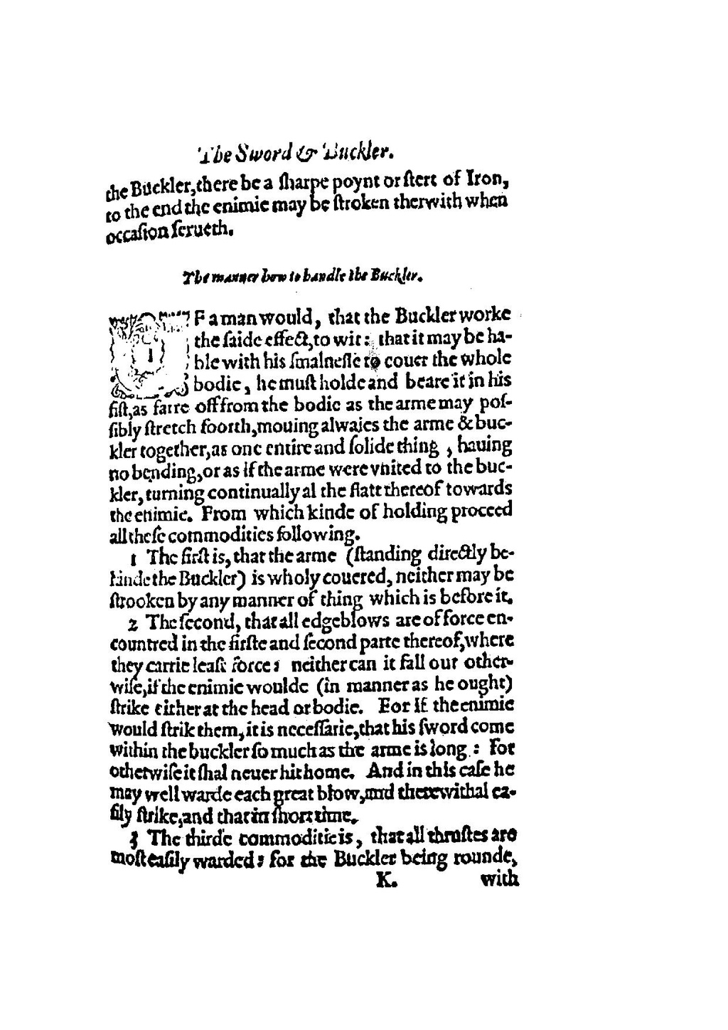 1 The first is, that the arme (standing directly behinde the Buckler) is wholy couered, neither may be strooken by any manner of thing which is before it.