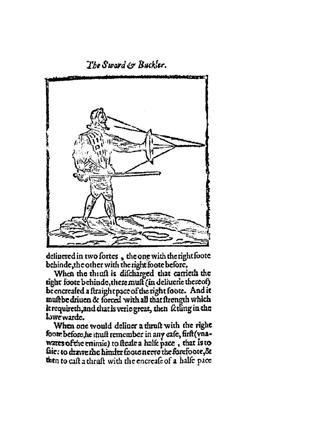When one would deliuer a thrust with the right foote before he must remember in any case, first (vnawares of the enimie) to steale a halfe pace, that is to saie: to drawe the hinder foote neere the forefoote, & then to cast a thrust with the encrease of a halfe pace for-
