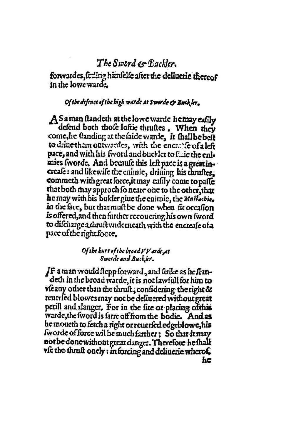 IF a man would stepp forward, and strike as he standeth in the broad warde, it is not lawfull for him to vse any other than the thrust, considering the right & reuersed blowes may not be deliuered without great perill and danger. For in the site or placing of this warde, the sword is farre off from the bodie. And as he moueth to fetch a right or reuersed edgeblowe, his sworde of force wil be much farther: So that it may not be done without great danger. Therefore he shall vse the thrust onely: in forcing and deliuerie wherof, he