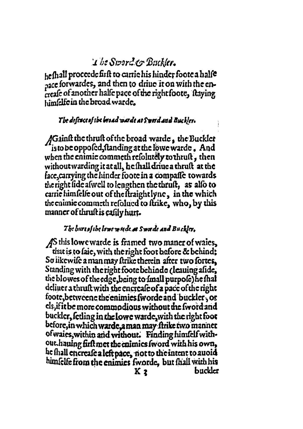 AS this lowe warde is framed two maner of waies, that is to saie, with the right foot before & behind: So likewise a man may strike therein after two sortes, Standing with the right foote behinde (leauing aside, the blowes of the edge, being to small purpose) he shal deliuer a thrust with the encrease of a pace of the right foote, betweene the enimies sworde and buckler, or els, if it be more commodious without the sword and buckler, setling in the lowe warde, with the right foot before, in which warde, a man may strike two manner of waies, within and without. Finding himself without, hauing first met the enimies sword with his own, he shall encrease a left pace, not to the intent to auoid himselfe from the enimies sworde, but shall with his buckler