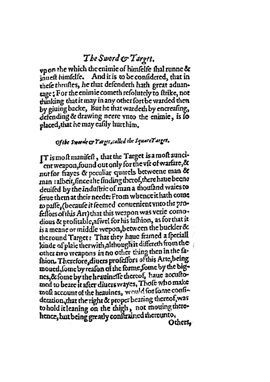 IT is most manifest, that the Target is a most auncient weapon, found out only for the vse of warfare, & not for frayes & peculiar quarels betweene man & man: albeit, since the finding therof, there haue beene deuised by the industrie of man a thousand waies to serue them at their neede: From whence it hath come to passe, (because it seemed conuenient vnto the professors of this Art) that this weapon was verie comodious & profitable, aswel for his fashion, as for that it is a meane or middle wepon, between the buckler & the round Target: That they haue framed a speciall kinde of plaie therwith, although it differeth from the other two weapons in no other thing then in the fashion. Therefore, diuers professors of this Arte, being moued, some by reason of the forme, some by the bignes, & some by the heauinesse thereof, haue accustomed to beare it after diuers wayes. Those who make most account of the heauines, would for some consideration, that the right & proper bearing thereof, was to hold it leaning on the thigh, not mouing therehence, but being greatly constrained thereunto. Others,