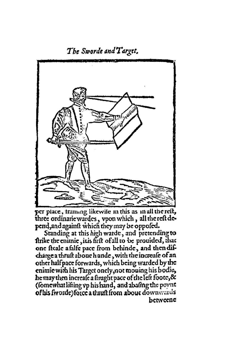 Standing at this high warde, and pretending to strike the enimie, it is first of all to be prouided, that one steale a falfe pace from behinde, and then discharge a thrust aboue hande, with the increase of an other half pace forwards, which being warded by the enimie with his target onely, not mouing his bodie, he may then increase a straght pace of the left foote, & (somewhat lifting vp his hand, and abasing the poynt of his sworde) force a thrust from aboue downwards betweene