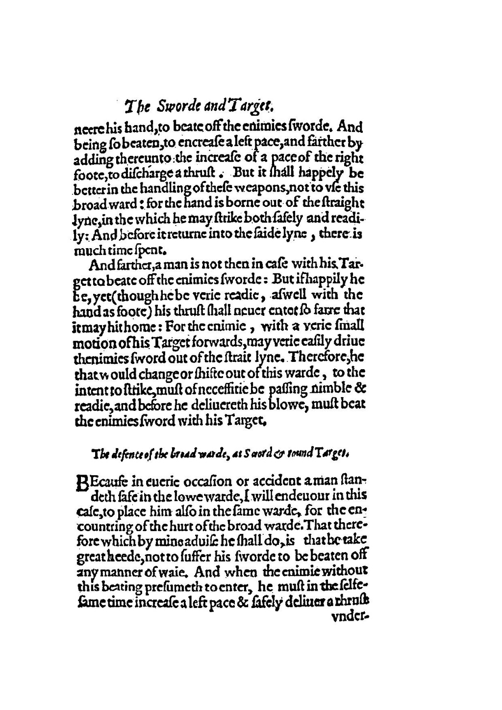 neere his hand, to beate off the enimies sworde. And being so beaten, to encrease a left pace, and farther by adding thereunto the increase of a pace of the right foote, to discharge a thrust. But it shall happely be better in the handling of these weapons, not to vse this broad ward: for the hand is borne out of the straight lyne, in the which he may strike both safely and readily: And before it returne into the saide lyne, there is much time spent.