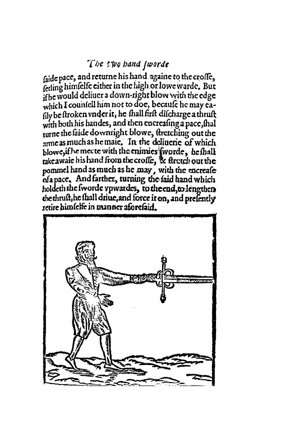 saide pace, and returne his hand againe to the crosse, setling himselfe either in the high or lowe warde. But if he would deliuer a down-right blow with the edge which I counsell him not to doe, because he may easily be stroken vnder it, he shall first discharge a thrust with both his handes, and then encreasing a pace, shal turne the saide downright blowe, stretching out the arme as much as he maie. In the deliuerie of which blowe, if he meete with the enimies sworde, he shall take awaie his hand from the crosse, & stretch out the pommel hand as much as he may, with the encrease of a pace. And farther, turning the said hand which holdeth the sworde vpwardes, to the end, to lengthen the thrust, he shall driue, and force it on, and presently retire himselfe in manner aforesaid.
