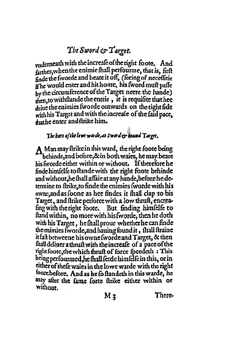 A Man may strike in this ward, the right foote being behinde, and before, & in both waies, he may beare his sworde either within or without. If therefore he finde himselfe to stande with the right foote behinde and without, he shall assaie at any hande, before he determine to strike, to finde the enimies sworde with his owne, and as soone as hee findes it shall clap to his Target, and strike perforce with a low thrust, encreasing with the right foote. But finding himselfe to stand within, no more with his sworde, then he doth with his Target, he shall proue whether he can finde the enimies sworde, and hauing found it, shall straine it fast betweene his owne sworde and Target, & then shall deliuer a thrust with the increase of a pace of the right foote, the which thrust of force speedeth: This being perfourmed, he shall settle himselfe in this, or in either of these waies in the lowe warde with the right foote before. And as he so standeth in this warde, he may after the same sorte strike either within or without. There-