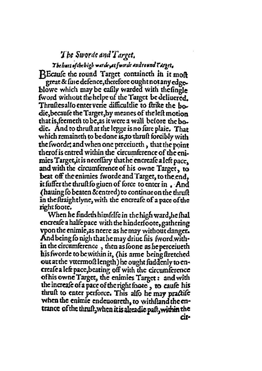 BEcause the round Target containeth in it most great & sure defence, therefore ought not any edgeblowe which may be easily warded with the single sword without the helpe of the Target be deliuered. Thrustes also enter verie difficultlie to strike the bodie, because the Target, by meanes of the lest motion that is, seemeth to be, as it were a wall before the bodie. And to thrust at the legge is no sure plaie. That which remaineth to be done is, to thrust forcibly with the sworde: and when one perceiueth, that the point therof is entred within the circumference of the enimies Target, it is necessary that he encrease a left pace, and with the circumference of his owne Target, to beat off the enimies sworde and Target, to the end, it suffer the thrust so giuen of force to enter in. And (hauing so beaten & entred) to continue on the thrust in the straightlyne, with the encrease of a pace of the right foote.