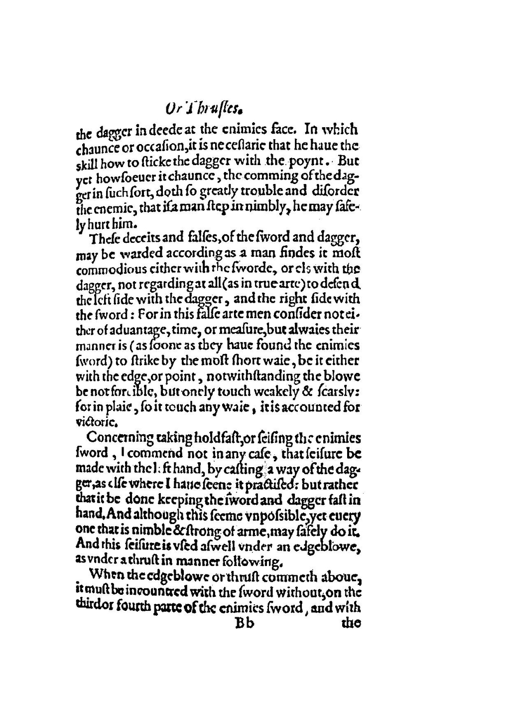 These deceits and falses, of the sword and dagger, may be warded according as a man findes it most commodious either with the sworde, or els with the dagger, not regarding at all (as in true arte) to defend the left side with the dagger, and the right sid with the sword: For in this false arte men consider not either of aduantage, time, or measure, but alwaies their manner is (as soone as they haue found the enimies sword) to strike by the most short waie, be it either with the edge, or point, notwithstanding the blowe be not forcible, but onely touch weakely & scarslv: for in plaie, so it touch any waie, it is accounted for victorie.