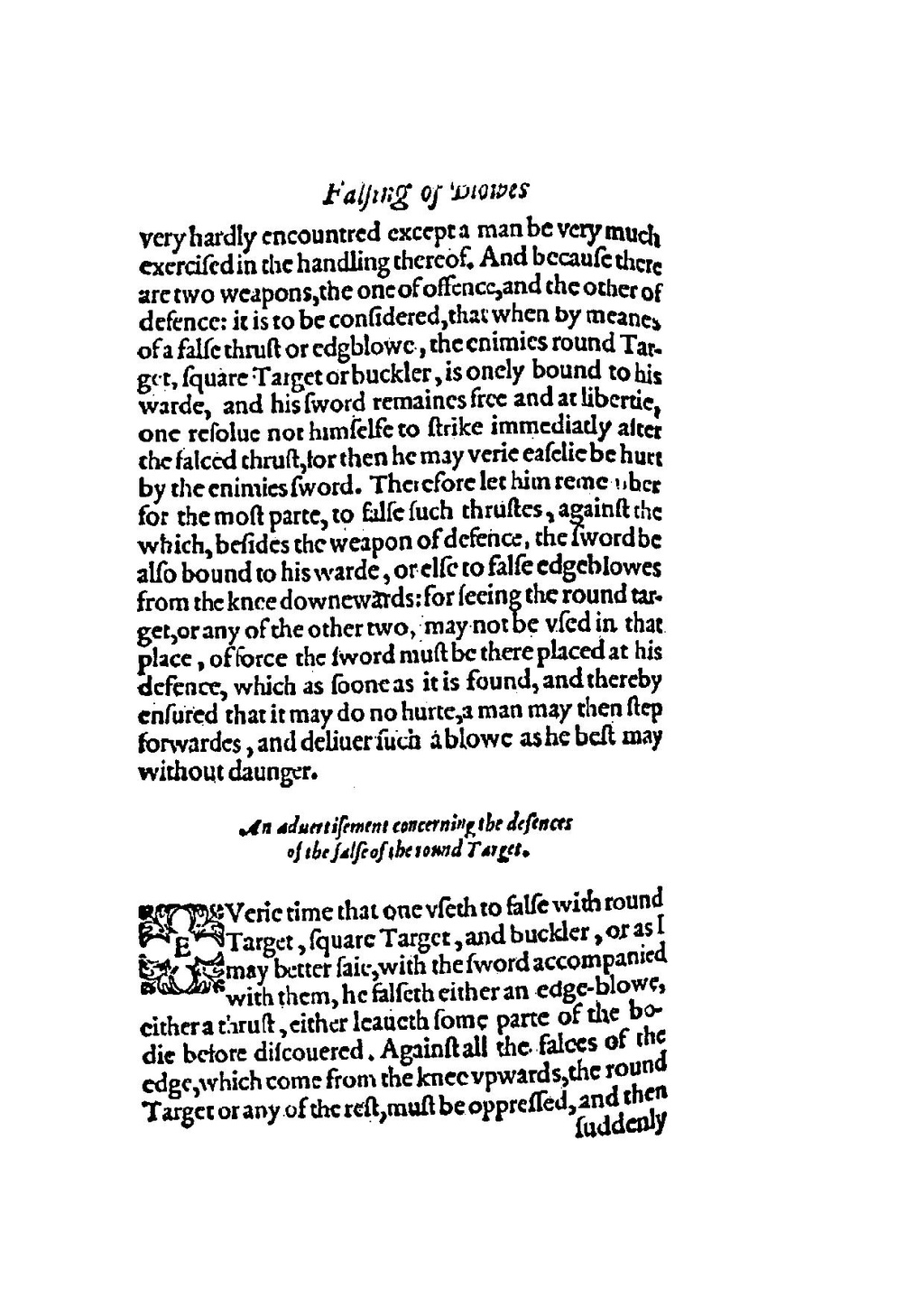 EVerie time that one vseth to false with round Target, square Target, and buckler, or as I may better saie, with the sword accompanied with them, he falseth either an edge-blowe, either a thrust, either leaueth some parte of the bodie before discouered. Against all the falces of the edge, which come from the knee vpwards, the round Target or any of the rest, must be oppressed, and then